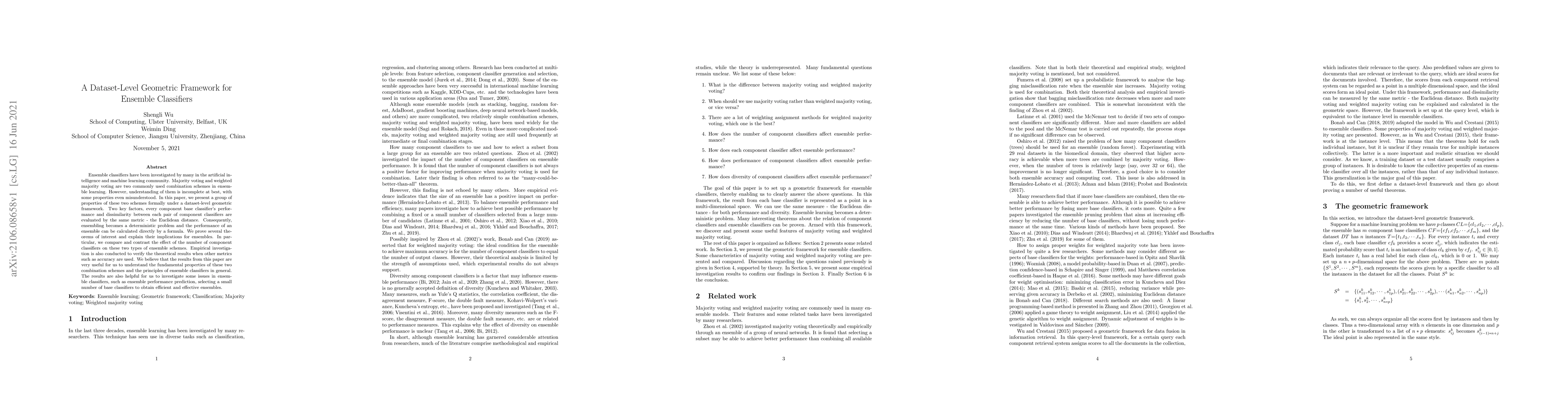 This paper introduces a dataset-level geometric framework to understand ensemble classifiers, focusing on majority and weighted majority voting schemes. It formalizes properties of these schemes, evaluates component classifiers' performance and dissimilarity using Euclidean distance, and provides a formula to calculate ensemble performance directly.