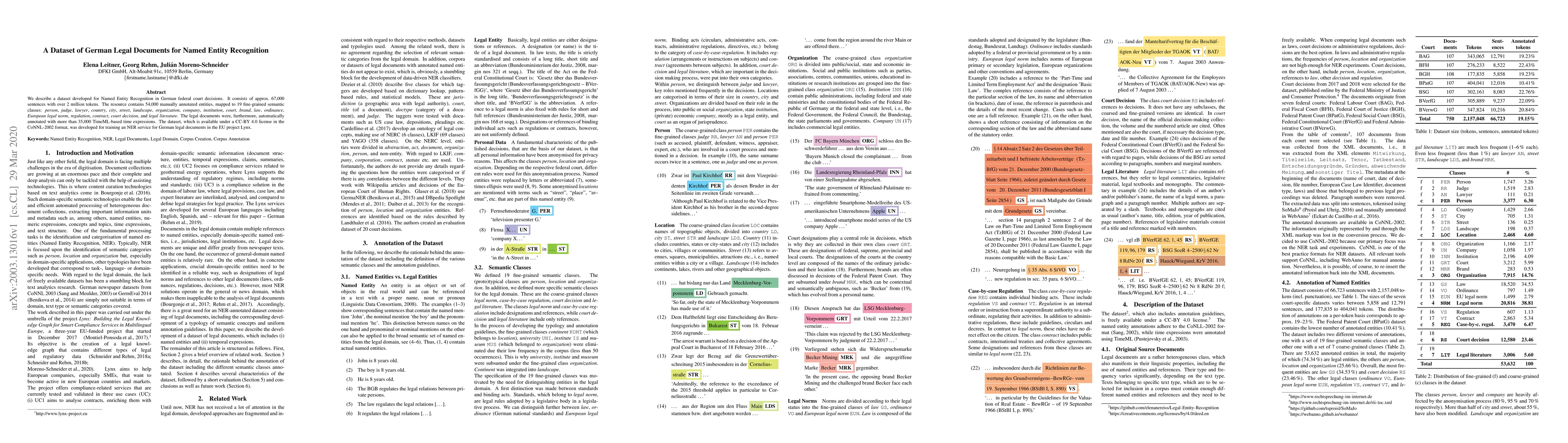 The paper introduces a dataset of German legal documents for Named Entity Recognition, comprising 67,000 sentences with 2 million tokens, containing 54,000 manually annotated entities across 19 semantic classes, and over 35,000 time expressions. The dataset aims to train an NER service for German legal texts within the EU project Lynx.
