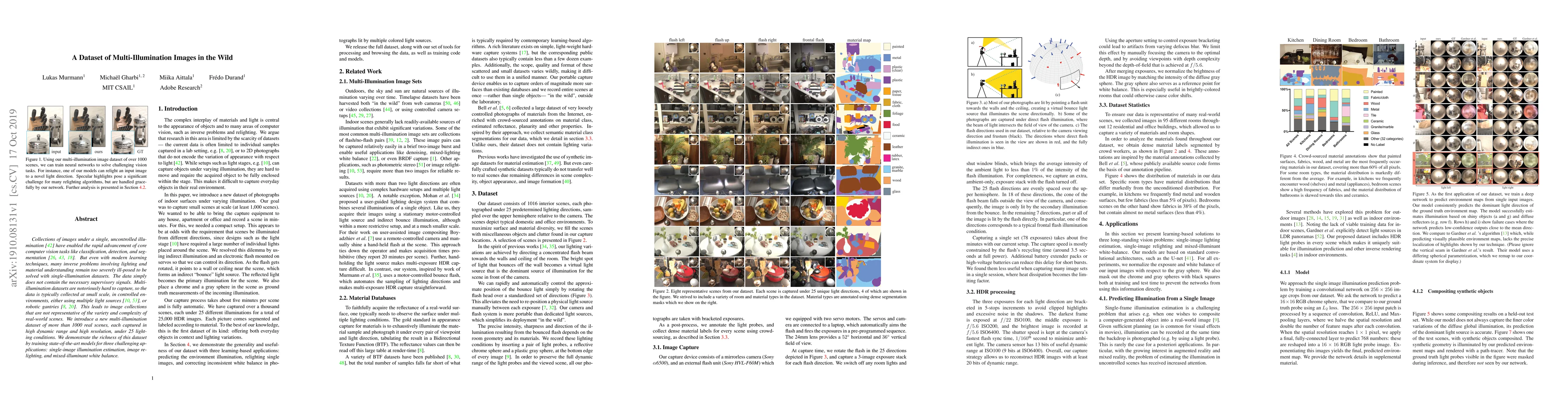 Collections of images under a single, uncontrolled illumination have enabled the rapid advancement of core computer vision tasks like classification, detection, and segmentation. But even with modern learning techniques, many inverse problems involving lighting and material understanding remain too severely ill-posed to be solved with single-illumination datasets. To fill this gap, we introduce a new multi-illumination dataset of more than 1000 real scenes, each captured under 25 lighting conditions. We demonstrate the richness of this dataset by training state-of-the-art models for three challenging applications: single-image illumination estimation, image relighting, and mixed-illuminant white balance.