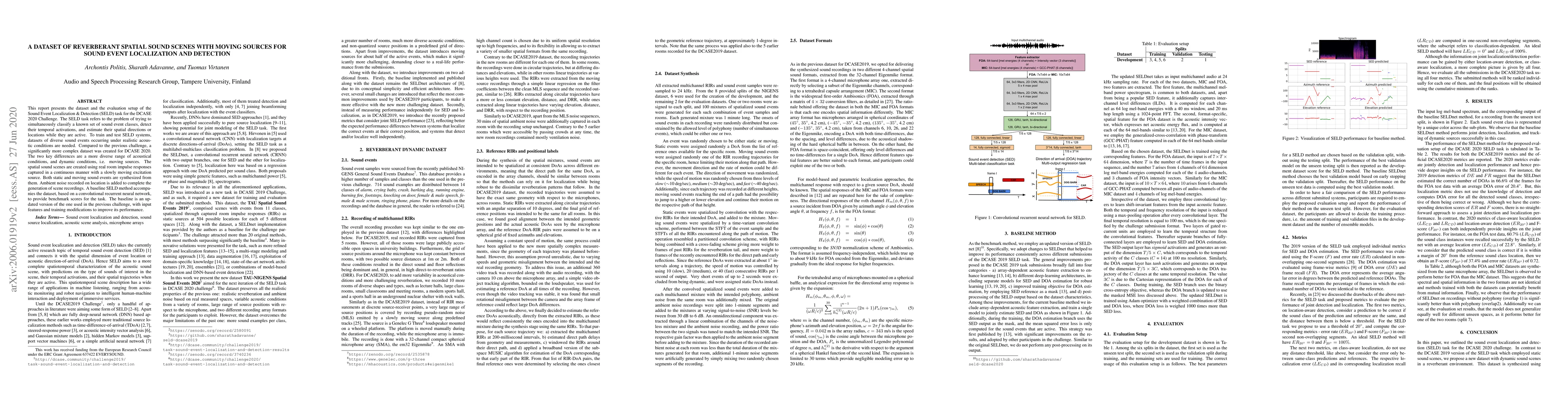 This report presents the dataset and the evaluation setup of the Sound Event Localization & Detection (SELD) task for the DCASE 2020 Challenge. The SELD task refers to the problem of trying to simultaneously classify a known set of sound event classes, detect their temporal activations, and estimate their spatial directions or locations while they are active. To train and test SELD systems, datasets of diverse sound events occurring under realistic acoustic conditions are needed. Compared to the previous challenge, a significantly more complex dataset was created for DCASE 2020. The two key differences are a more diverse range of acoustical conditions, and dynamic conditions, i.e. moving sources. The spatial sound scenes are created using real room impulse responses captured in a continuous manner with a slowly moving excitation source. Both static and moving sound events are synthesized from them. Ambient noise recorded on location is added to complete the generation of scene recordings. A baseline SELD method accompanies the dataset, based on a convolutional recurrent neural network, to provide benchmark scores for the task. The baseline is an updated version of the one used in the previous challenge, with input features and training modifications to improve its performance.