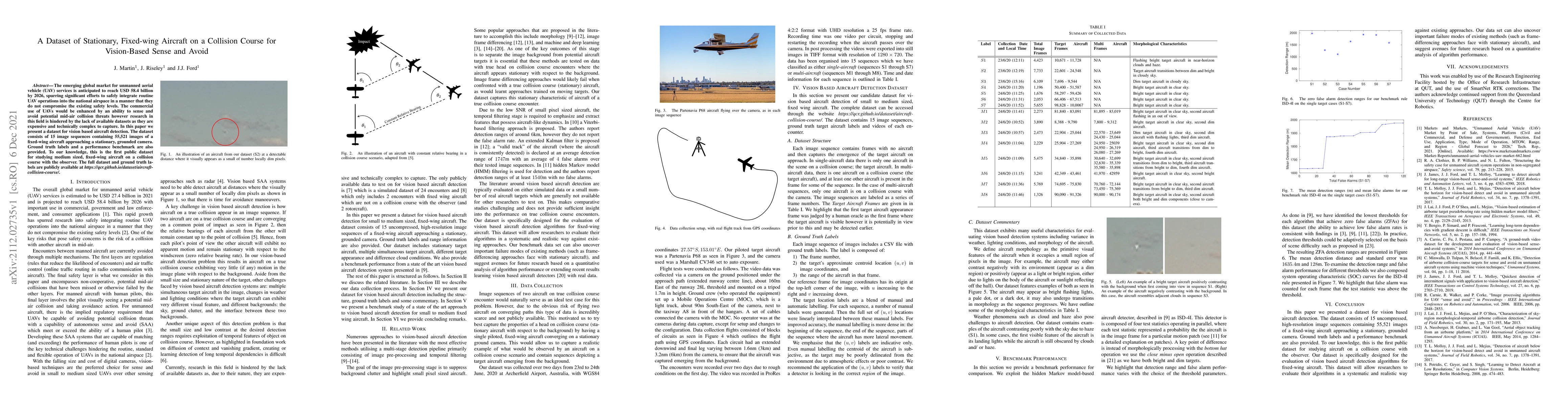 The emerging global market for unmanned aerial vehicle (UAV) services is anticipated to reach USD 58.4 billion by 2026, spurring significant efforts to safely integrate routine UAV operations into the national airspace in a manner that they do not compromise the existing safety levels. The commercial use of UAVs would be enhanced by an ability to sense and avoid potential mid-air collision threats however research in this field is hindered by the lack of available datasets as they are expensive and technically complex to capture. In this paper we present a dataset for vision based aircraft detection. The dataset consists of 15 image sequences containing 55,521 images of a fixed-wing aircraft approaching a stationary, grounded camera. Ground truth labels and a performance benchmark are also provided. To our knowledge, this is the first public dataset for studying medium sized, fixed-wing aircraft on a collision course with the observer. The full dataset and ground truth labels are publicly available at https://qcr.github.io/dataset/aircraft-collision-course/.