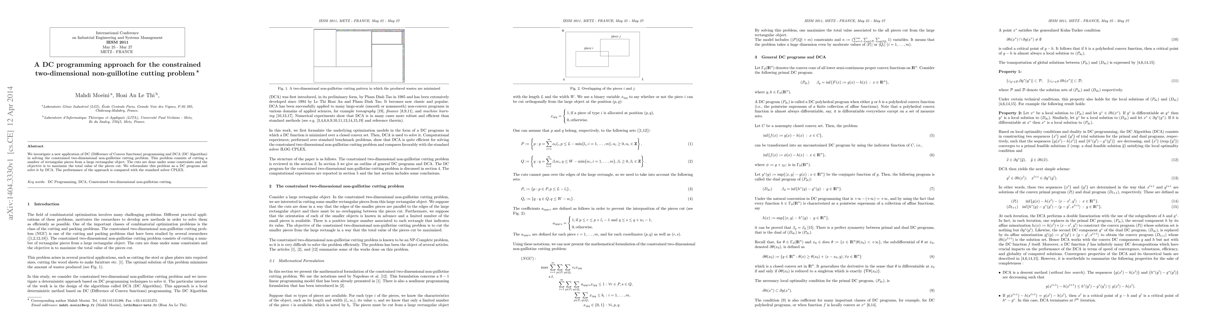 This paper applies Difference of Convex functions programming and DCA to solve the constrained two-dimensional non-guillotine cutting problem, reformulating it as a DC program and comparing its performance with the standard solver CPLEX.