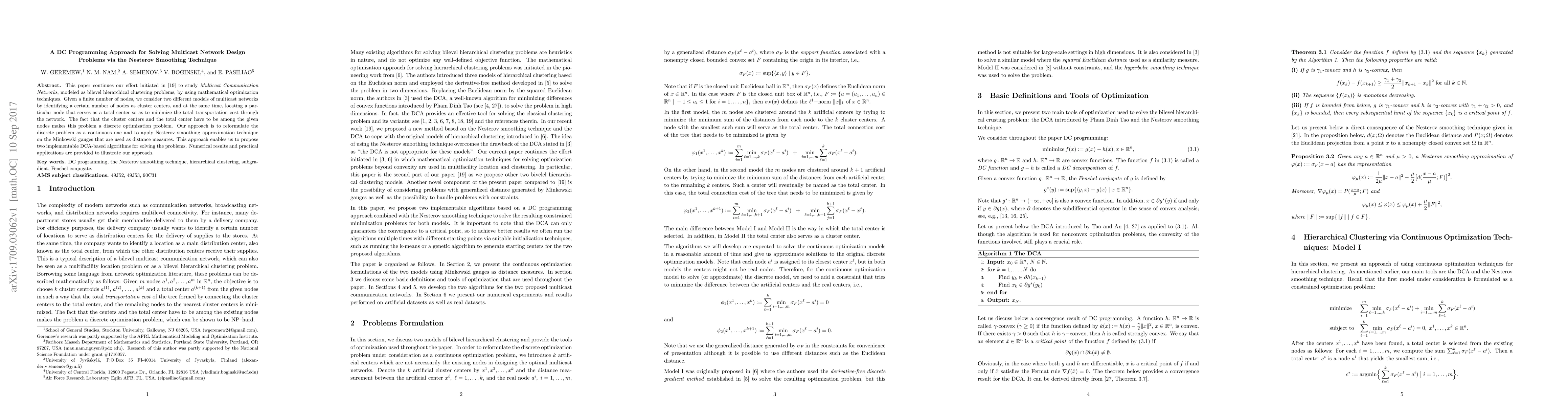 This paper proposes a DC programming approach using Nesterov smoothing to solve multicast network design problems, which aims to minimize total transportation costs through networks with identified cluster centers and a central node.