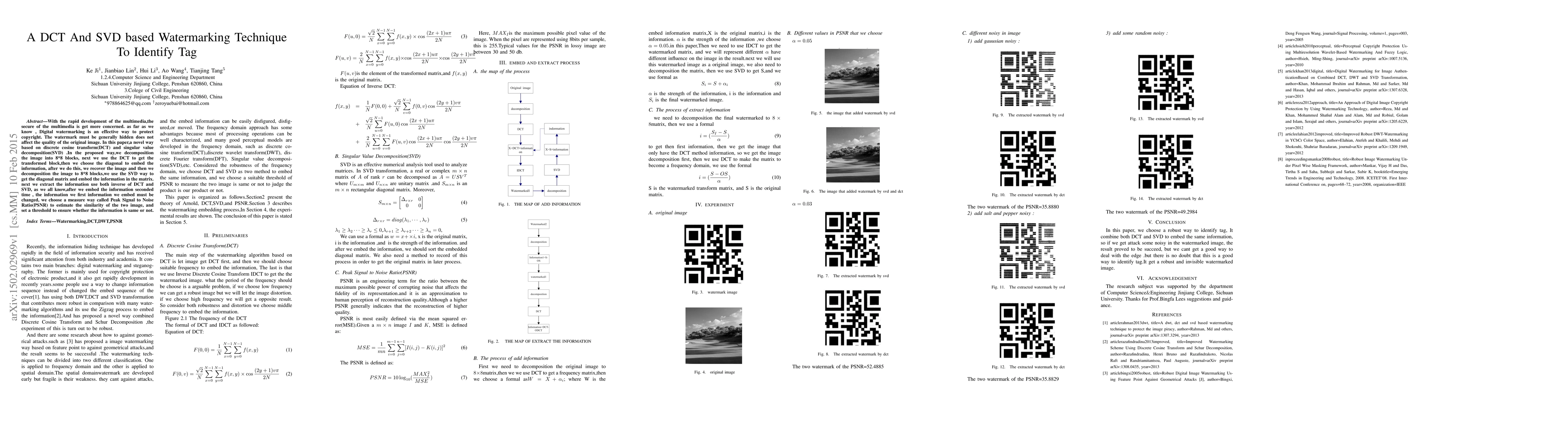 With the rapid development of the multimedia,the secure of the multimedia is get more concerned. as far as we know , Digital watermarking is an effective way to protect copyright. The watermark must be generally hidden does not affect the quality of the original image. In this paper,a novel way based on discrete cosine transform(DCT) and singular value decomposition(SVD) .In the proposed way,we decomposition the image into 8*8 blocks, next we use the DCT to get the transformed block,then we choose the diagonal to embed the information, after we do this, we recover the image and then we decomposition the image to 8*8 blocks,we use the SVD way to get the diagonal matrix and embed the information in the matrix. next we extract the information use both inverse of DCT and SVD, as we all know,after we embed the information seconded time , the information we first information we embed must be changed, we choose a measure way called Peak Signal to Noise Ratio(PSNR) to estimate the similarity of the two image, and set a threshold to ensure whether the information is same or not.