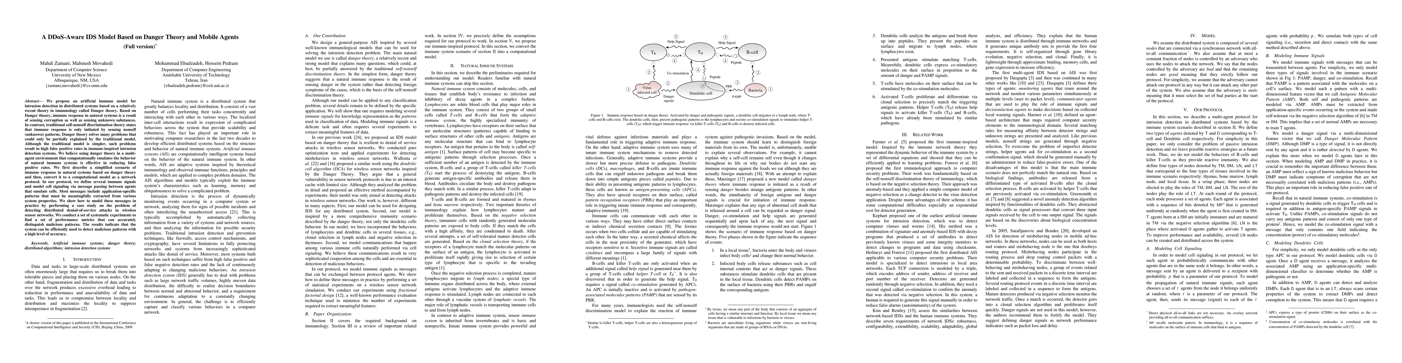 We propose an artificial immune model for intrusion detection in distributed systems based on a relatively recent theory in immunology called Danger theory. Based on Danger theory, immune response in natural systems is a result of sensing corruption as well as sensing unknown substances. In contrast, traditional self-nonself discrimination theory states that immune response is only initiated by sensing nonself (unknown) patterns. Danger theory solves many problems that could only be partially explained by the traditional model. Although the traditional model is simpler, such problems result in high false positive rates in immune-inspired intrusion detection systems. We believe using danger theory in a multi-agent environment that computationally emulates the behavior of natural immune systems is effective in reducing false positive rates. We first describe a simplified scenario of immune response in natural systems based on danger theory and then, convert it to a computational model as a network protocol. In our protocol, we define several immune signals and model cell signaling via message passing between agents that emulate cells. Most messages include application-specific patterns that must be meaningfully extracted from various system properties. We show how to model these messages in practice by performing a case study on the problem of detecting distributed denial-of-service attacks in wireless sensor networks. We conduct a set of systematic experiments to find a set of performance metrics that can accurately distinguish malicious patterns. The results indicate that the system can be efficiently used to detect malicious patterns with a high level of accuracy.