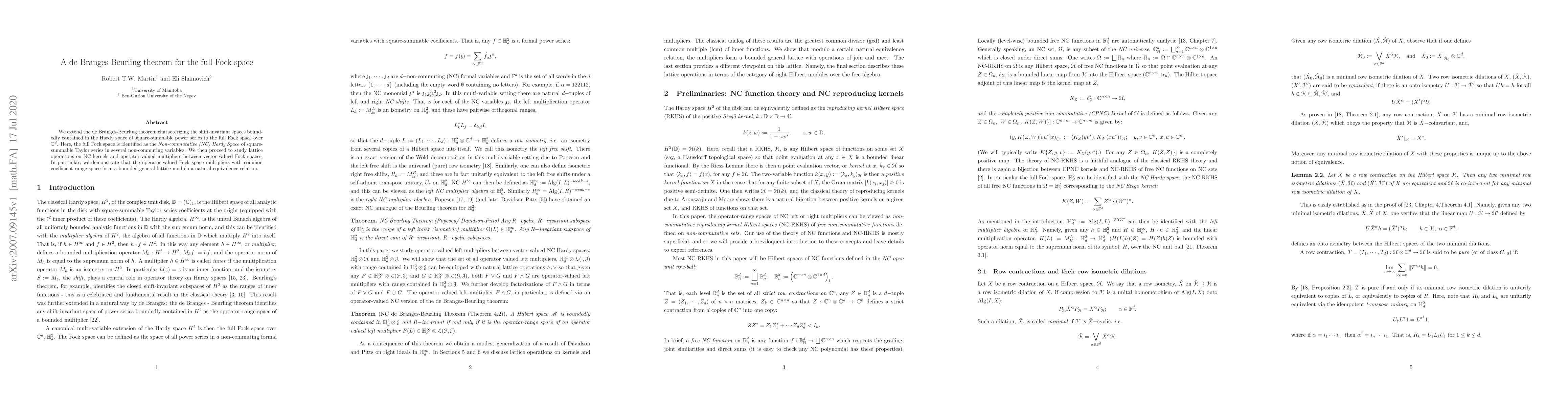 We extend the de Branges-Beurling theorem characterizing the shift-invariant spaces boundedly contained in the Hardy space of square-summable power series to the full Fock space over $\mathbb{C} ^d$. Here, the full Fock space is identified as the \emph{Non-commutative (NC) Hardy Space} of square-summable Taylor series in several non-commuting variables. We then proceed to study lattice operations on NC kernels and operator-valued multipliers between vector-valued Fock spaces. In particular, we demonstrate that the operator-valued Fock space multipliers with common coefficient range space form a bounded general lattice modulo a natural equivalence relation.
