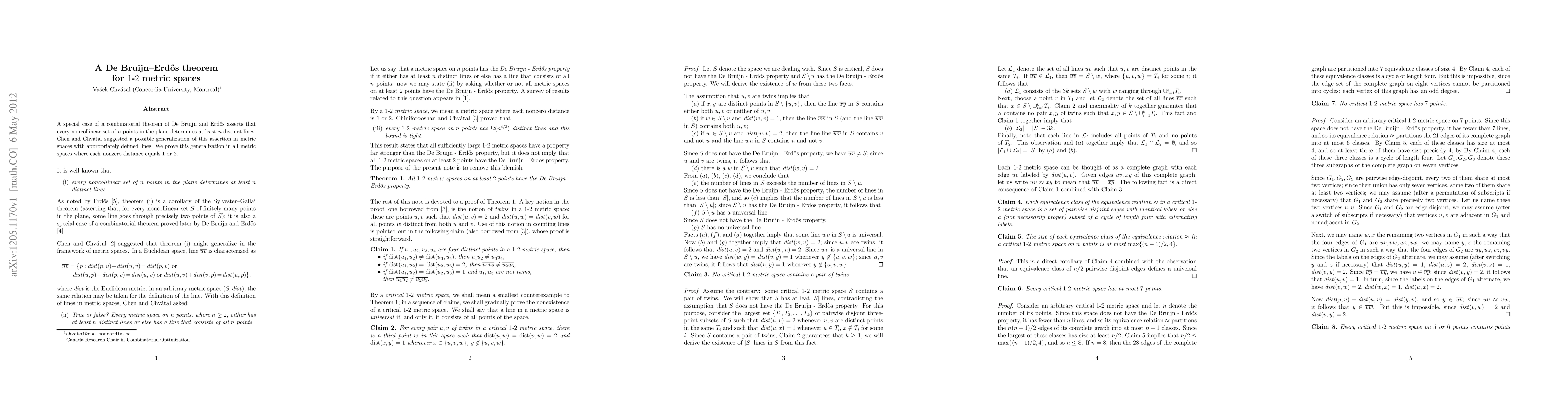 A special case of a combinatorial theorem of De Bruijn and Erdos asserts that every noncollinear set of n points in the plane determines at least n distinct lines. Chen and Chvatal suggested a possible generalization of this assertion in metric spaces with appropriately defined lines. We prove this generalization in all metric spaces where each nonzero distance equals 1 or 2.