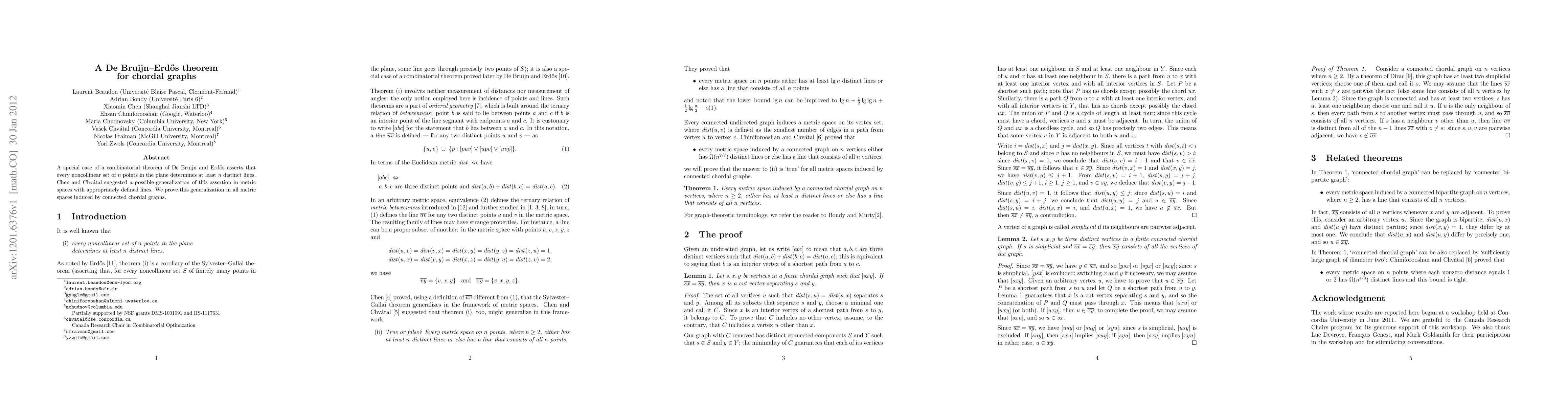 A special case of a combinatorial theorem of De Bruijn and Erdos asserts that every noncollinear set of n points in the plane determines at least n distinct lines. Chen and Chvatal suggested a possible generalization of this assertion in metric spaces with appropriately defined lines. We prove this generalization in all metric spaces induced by connected chordal graphs.