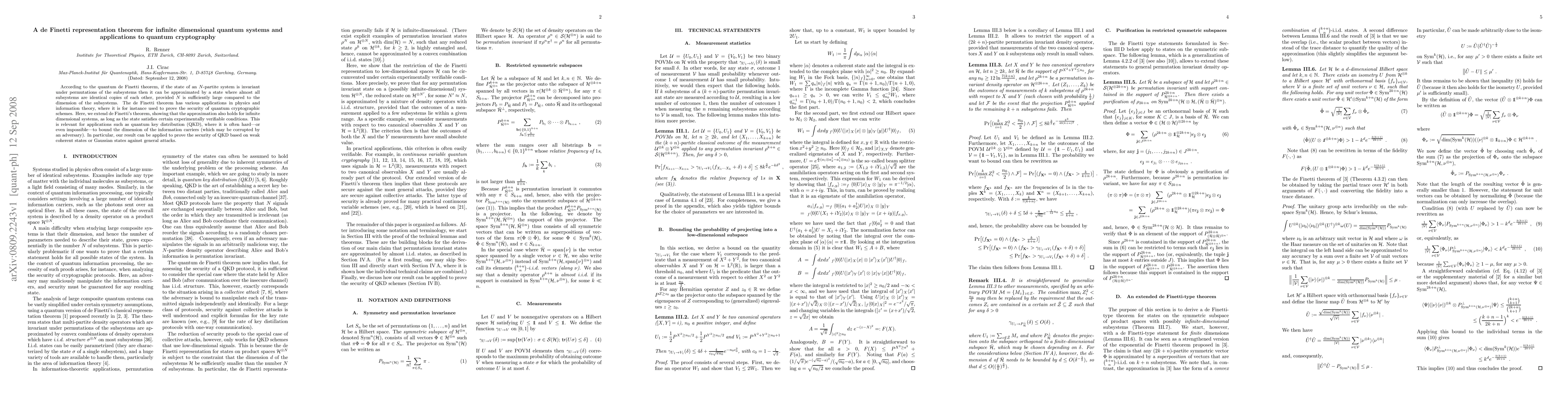 This paper extends the quantum de Finetti theorem to infinite dimensional quantum systems, demonstrating that states invariant under subsystem permutations can be approximated by identical copies, thus proving the security of quantum key distribution schemes using weak coherent or Gaussian states against general attacks.