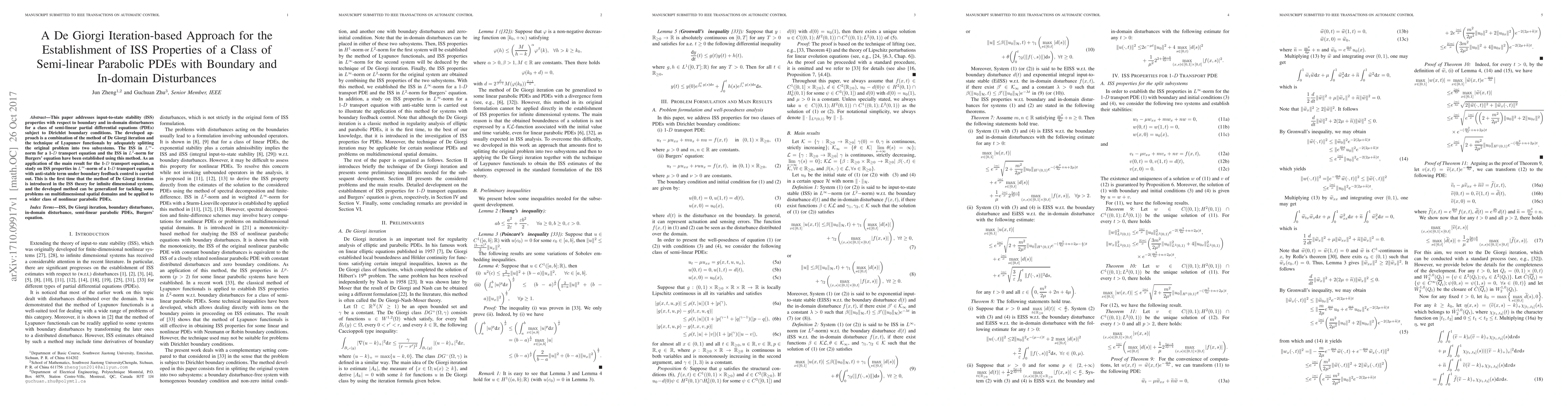 This paper establishes input-to-state stability (ISS) properties for semi-linear parabolic PDEs using a De Giorgi iteration-based approach combined with Lyapunov functionals. The method is applied to 1-D transport and Burgers' equations, demonstrating ISS in $L^\infty$ and $L^2$ norms respectively.