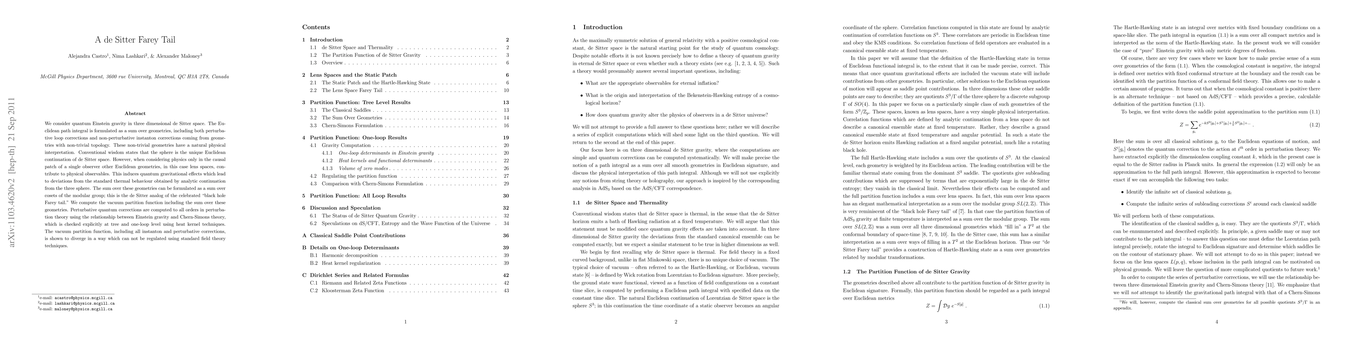 We consider quantum Einstein gravity in three dimensional de Sitter space. The Euclidean path integral is formulated as a sum over geometries, including both perturbative loop corrections and non-perturbative instanton corrections coming from geometries with non-trivial topology. These non-trivial geometries have a natural physical interpretation. Conventional wisdom states that the sphere is the unique Euclidean continuation of de Sitter space. However, when considering physics only in the causal patch of a single observer other Euclidean geometries, in this case lens spaces, contribute to physical observables. This induces quantum gravitational effects which lead to deviations from the standard thermal behaviour obtained by analytic continuation from the three sphere. The sum over these geometries can be formulated as a sum over cosets of the modular group; this is the de Sitter analog of the celebrated "black hole Farey tail." We compute the vacuum partition function including the sum over these geometries. Perturbative quantum corrections are computed to all orders in perturbation theory using the relationship between Einstein gravity and Chern-Simons theory, which is checked explicitly at tree and one-loop level using heat kernel techniques. The vacuum partition function, including all instanton and perturbative corrections, is shown to diverge in a way which can not be regulated using standard field theory techniques.