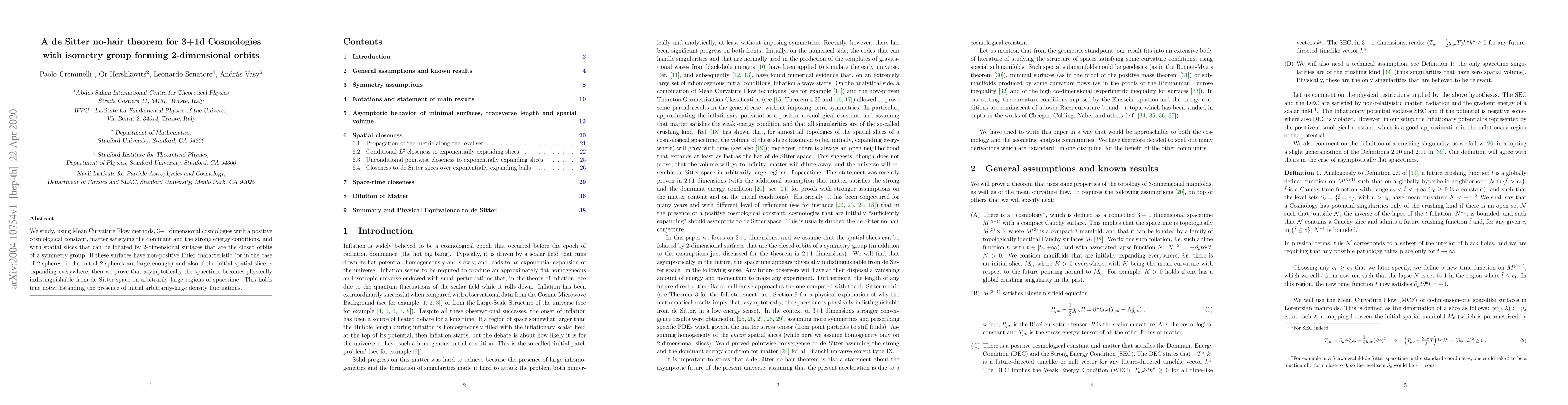 We study, using Mean Curvature Flow methods, 3+1 dimensional cosmologies with a positive cosmological constant, matter satisfying the dominant and the strong energy conditions, and with spatial slices that can be foliated by 2-dimensional surfaces that are the closed orbits of a symmetry group. If these surfaces have non-positive Euler characteristic (or in the case of 2-spheres, if the initial 2-spheres are large enough) and also if the initial spatial slice is expanding everywhere, then we prove that asymptotically the spacetime becomes physically indistinguishable from de Sitter space on arbitrarily large regions of spacetime. This holds true notwithstanding the presence of initial arbitrarily-large density fluctuations.