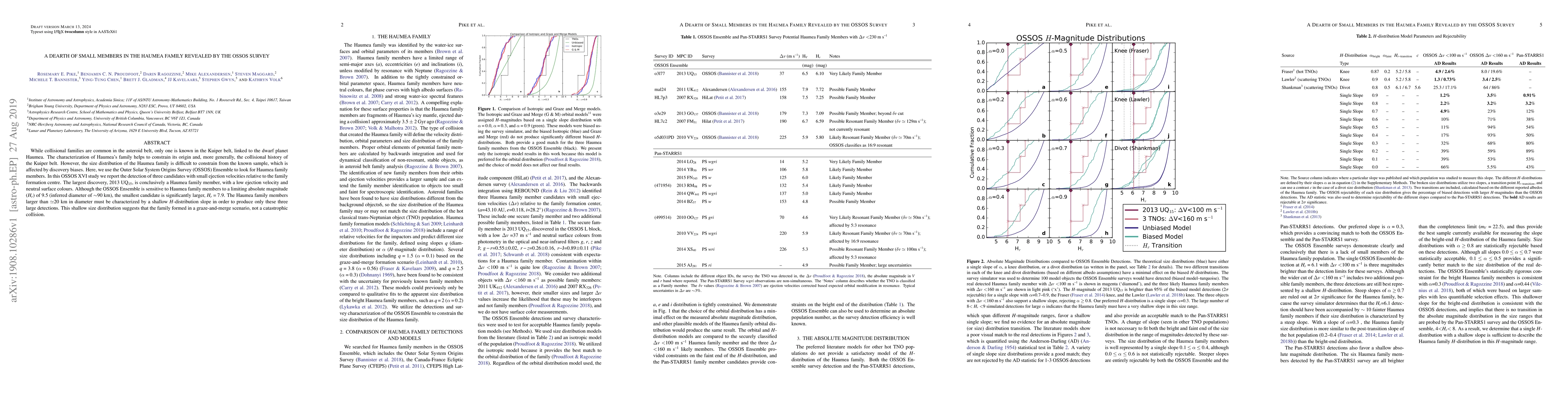 The OSSOS survey reveals three Haumea family members, with the largest, 2013 UQ15, having low ejection velocity and neutral surface colors. This implies a graze-and-merge formation scenario for the family, rather than a catastrophic collision, as the size distribution is shallower than expected.