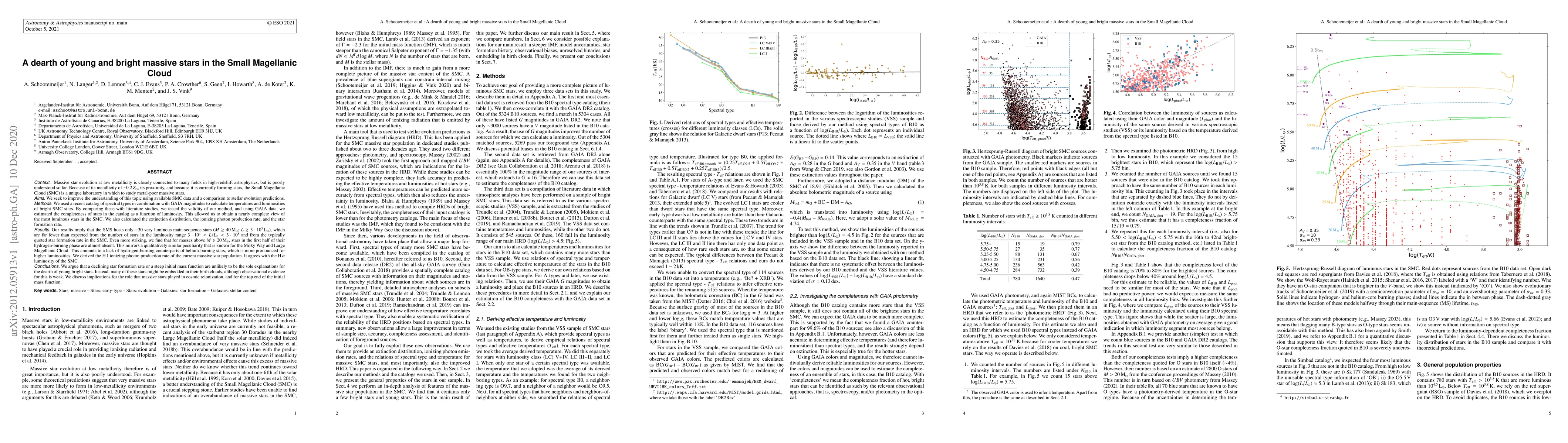 Massive star evolution at low metallicity is closely connected to many fields in high-redshift astrophysics, but poorly understood. The Small Magellanic Cloud (SMC) is a unique laboratory to study this because of its metallicity of 0.2 Zsol, its proximity, and because it is currently forming stars. We used a spectral type catalog in combination with GAIA magnitudes to calculate temperatures and luminosities of bright SMC stars. By comparing these with literature studies, we tested the validity of our method, and using GAIA data, we estimated the completeness of stars in the catalog as a function of luminosity. This allowed us to obtain a nearly complete view of the most luminous stars in the SMC. When then compared with stellar evolution predictions. We also calculated the extinction distribution, the ionizing photon production rate, and the star formation rate. Our results imply that the SMS hosts only 30 very luminous main-sequence stars (M > 40 Msol; L > 10^5 Lsol), which are far fewer than expected from the number of stars in the luminosity range 3*10^4 < L/Lsol < 3*10^5 and from the typically quoted star formation rate in the SMC. Even more striking, we find that for masses above M > 20 Msol, stars in the first half of their hydrogen-burning phase are almost absent. This mirrors a qualitatively similar peculiarity that is known for the Milky Way and Large Magellanic Cloud. This amounts to a lack of hydrogen-burning counterparts of helium-burning stars, which is more pronounced for higher luminosities. We argue that a declining star formation rate or a steep initial mass function are unlikely to be the sole explanations for the dearth of young bright stars. Instead, many of these stars might be embedded in their birth clouds, although observational evidence for this is weak. We discuss implications for cosmic reionization and the top end of the initial mass function.