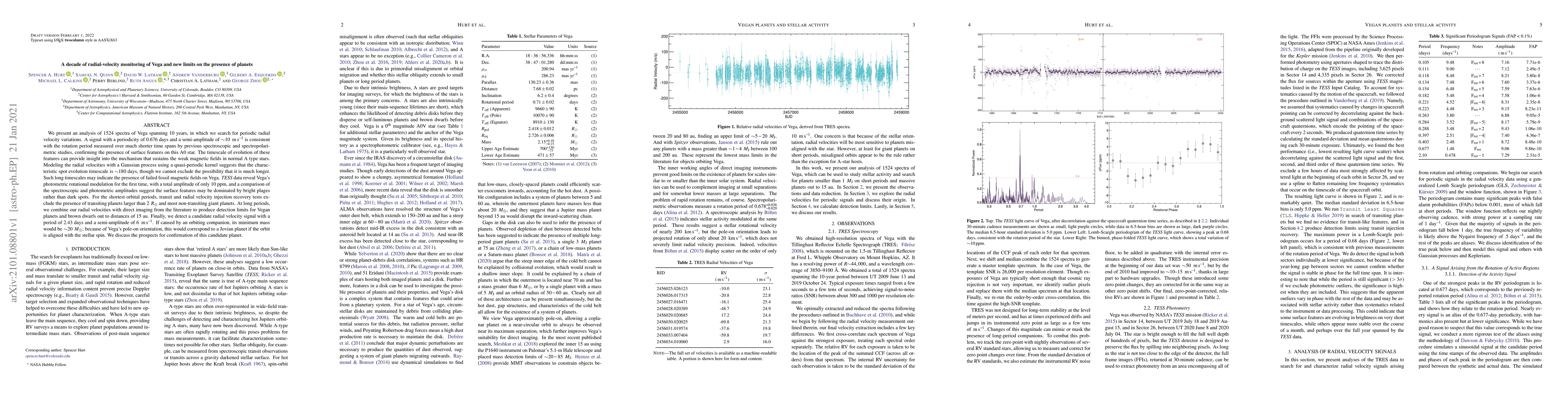 We present an analysis of 1524 spectra of Vega spanning 10 years, in which we search for periodic radial velocity variations. A signal with a periodicity of 0.676 days and a semi-amplitude of ~10 m/s is consistent with the rotation period measured over much shorter time spans by previous spectroscopic and spectropolarimetric studies, confirming the presence of surface features on this A0 star. The timescale of evolution of these features can provide insight into the mechanism that sustains the weak magnetic fields in normal A type stars. Modeling the radial velocities with a Gaussian process using a quasi-periodic kernel suggests that the characteristic spot evolution timescale is ~180 days, though we cannot exclude the possibility that it is much longer. Such long timescales may indicate the presence of failed fossil magnetic fields on Vega. TESS data reveal Vega's photometric rotational modulation for the first time, with a total amplitude of only 10 ppm, and a comparison of the spectroscopic and photometric amplitudes suggest the surface features may be dominated by bright plages rather than dark spots. For the shortest orbital periods, transit and radial velocity injection recovery tests exclude the presence of transiting planets larger than 2 Earth radii and most non-transiting giant planets. At long periods, we combine our radial velocities with direct imaging from the literature to produce detection limits for Vegan planets and brown dwarfs out to distances of 15 au. Finally, we detect a candidate radial velocity signal with a period of 2.43 days and a semi-amplitude of 6 m/s. If caused by an orbiting companion, its minimum mass would be ~20 Earth masses; because of Vega's pole-on orientation, this would correspond to a Jovian planet if the orbit is aligned with the stellar spin. We discuss the prospects for confirmation of this candidate planet.