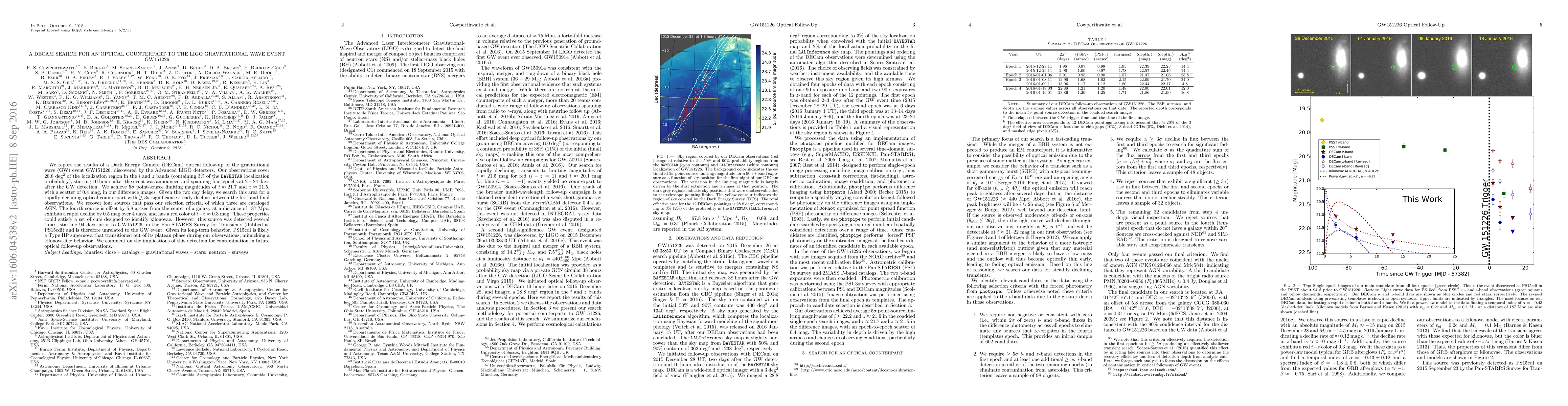 The DECam search for an optical counterpart to the LIGO gravitational wave event GW151226 found no new transient source directly associated with the event, despite identifying a rapidly declining object resembling a kilonova. The detected source, however, was previously observed, indicating it is likely a Type IIP supernova rather than a genuine kilonova.