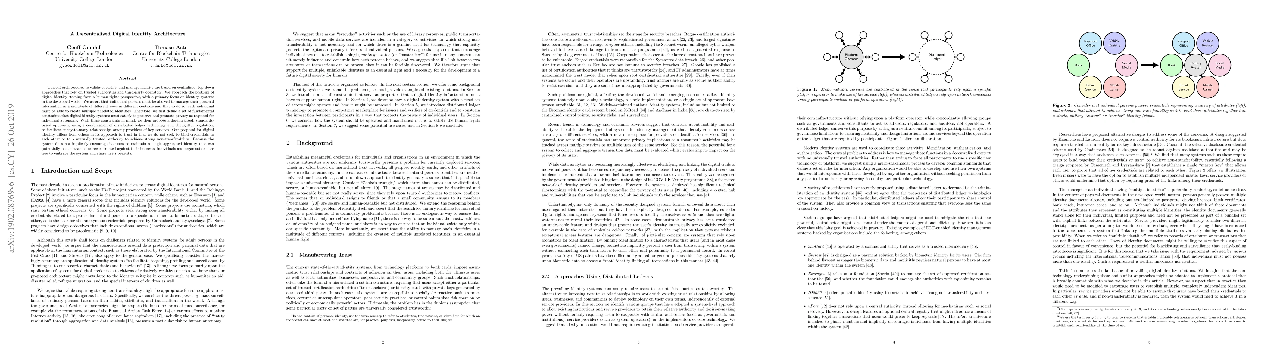 This paper proposes a decentralised digital identity architecture based on distributed ledger technology, aiming to empower individuals to manage their personal information autonomously. Unlike traditional systems, it avoids binding credentials to a central authority, allowing users to create multiple unrelated identities without compromising privacy.