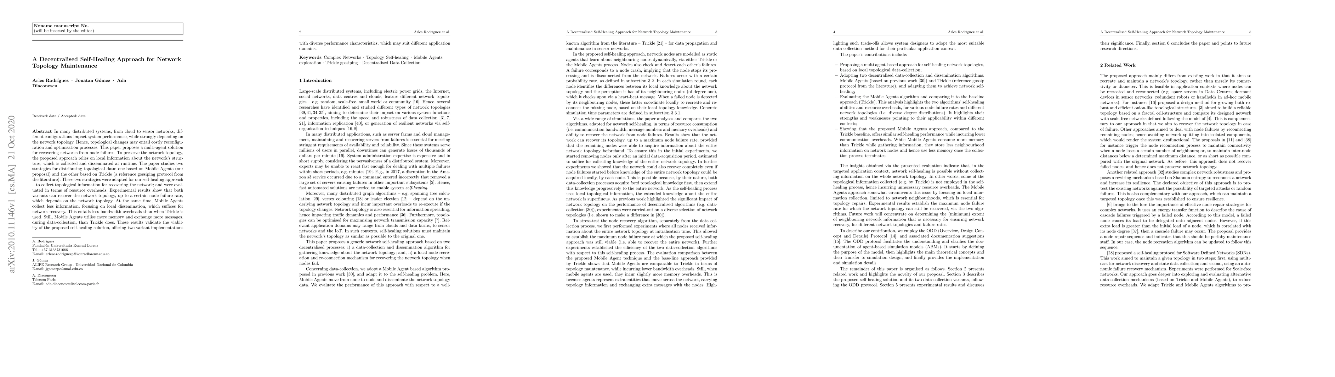 This paper proposes a decentralised self-healing approach for maintaining network topology in distributed systems using multi-agent strategies. It evaluates two methods—Mobile Agents and Trickle—showing that while both can recover networks, Mobile Agents use less bandwidth but require more memory and message exchanges.
