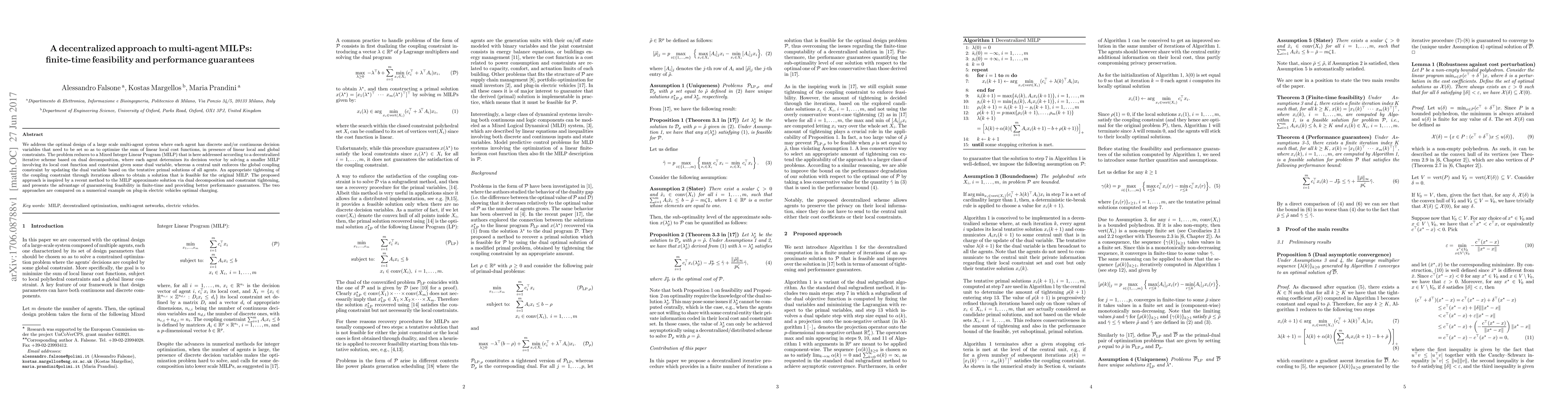We address the optimal design of a large scale multi-agent system where each agent has discrete and/or continuous decision variables that need to be set so as to optimize the sum of linear local cost functions, in presence of linear local and global constraints. The problem reduces to a Mixed Integer Linear Program (MILP) that is here addressed according to a decentralized iterative scheme based on dual decomposition, where each agent determines its decision vector by solving a smaller MILP involving its local cost function and constraint given some dual variable, whereas a central unit enforces the global coupling constraint by updating the dual variable based on the tentative primal solutions of all agents. An appropriate tightening of the coupling constraint through iterations allows to obtain a solution that is feasible for the original MILP. The proposed approach is inspired by a recent method to the MILP approximate solution via dual decomposition and constraint tightening, and presents the advantage of guaranteeing feasibility in finite-time and providing better performance guarantees. The two approaches are compared on a numerical example on plug-in electric vehicles optimal charging.