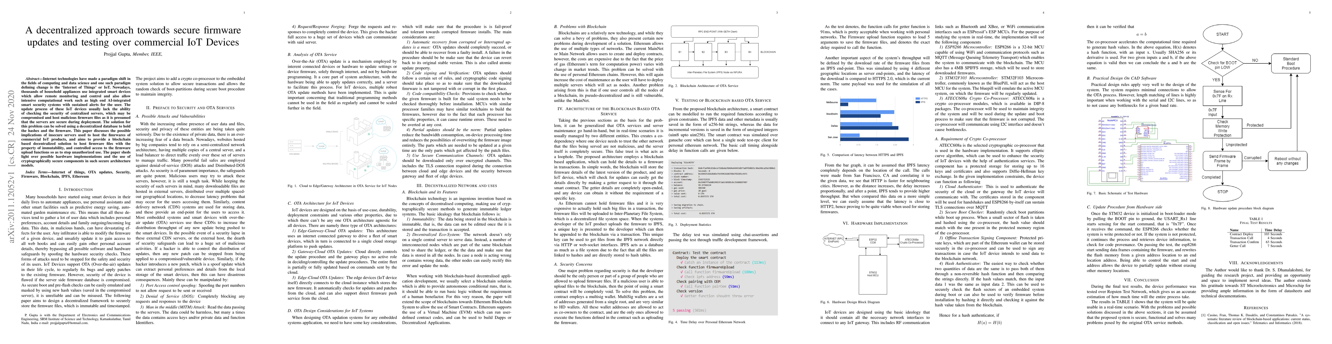 The paper proposes a decentralized blockchain-based architecture for secure firmware updates in commercial IoT devices, addressing issues of insecure centralized servers and lack of firmware integrity checks.