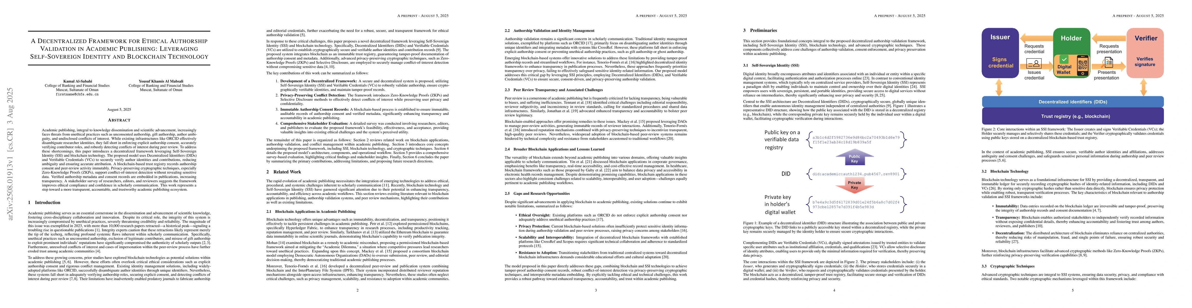 Academic publishing, integral to knowledge dissemination and scientific advancement, increasingly faces threats from unethical practices such as unconsented authorship, gift authorship, author ambiguity, and undisclosed conflicts of interest. While existing infrastructures like ORCID effectively disambiguate researcher identities, they fall short in enforcing explicit authorship consent, accurately verifying contributor roles, and robustly detecting conflicts of interest during peer review. To address these shortcomings, this paper introduces a decentralized framework leveraging Self-Sovereign Identity (SSI) and blockchain technology. The proposed model uses Decentralized Identifiers (DIDs) and Verifiable Credentials (VCs) to securely verify author identities and contributions, reducing ambiguity and ensuring accurate attribution. A blockchain-based trust registry records authorship consent and peer-review activity immutably. Privacy-preserving cryptographic techniques, especially Zero-Knowledge Proofs (ZKPs), support conflict-of-interest detection without revealing sensitive data. Verified authorship metadata and consent records are embedded in publications, increasing transparency. A stakeholder survey of researchers, editors, and reviewers suggests the framework improves ethical compliance and confidence in scholarly communication. This work represents a step toward a more transparent, accountable, and trustworthy academic publishing ecosystem.