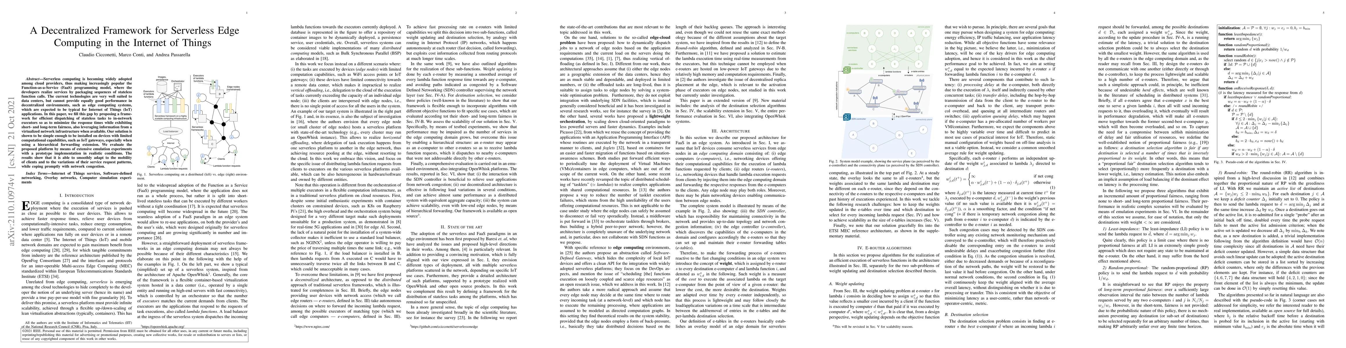 This paper proposes a decentralized framework for serverless edge computing in IoT applications, aiming to efficiently dispatch stateless tasks to in-network executors to minimize response times and ensure fairness. The solution is lightweight and adaptable, demonstrated through extensive emulation experiments showing its effectiveness in dynamic environments.