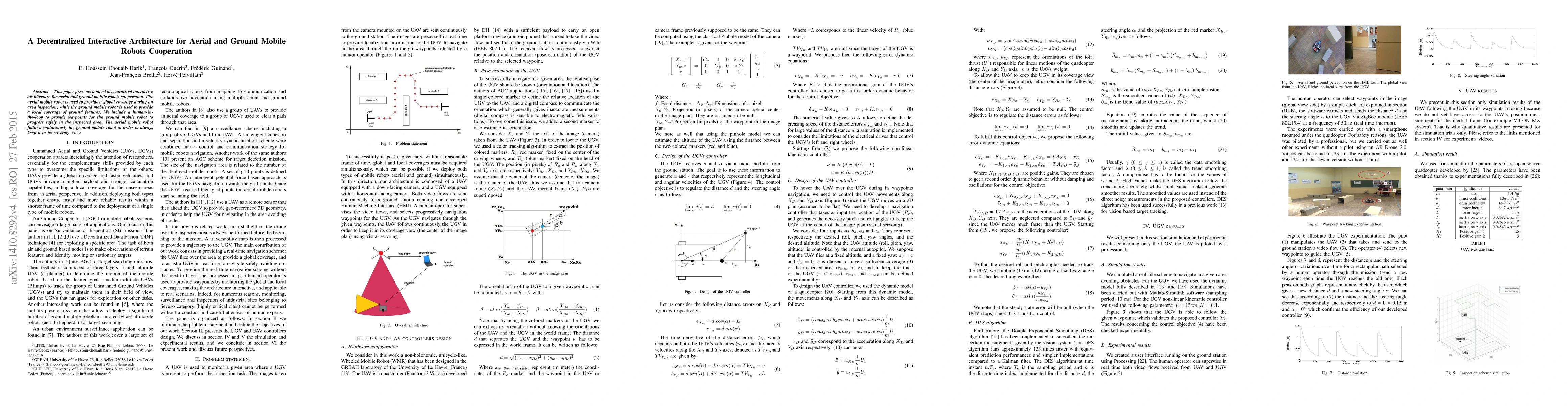 This paper presents a novel decentralized interactive architecture for aerial and ground mobile robots cooperation. The aerial mobile robot is used to provide a global coverage during an area inspection, while the ground mobile robot is used to provide a local coverage of ground features. We include a human-in-the-loop to provide waypoints for the ground mobile robot to progress safely in the inspected area. The aerial mobile robot follows continuously the ground mobile robot in order to always keep it in its coverage view.