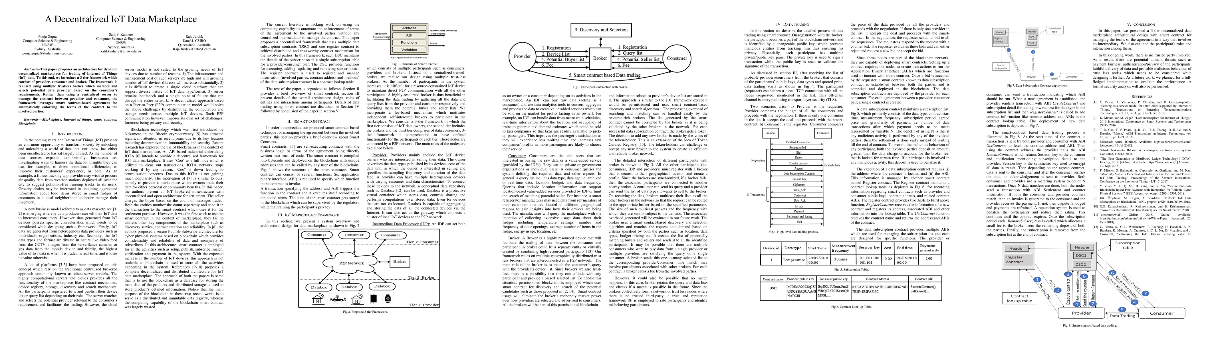This paper introduces a decentralized IoT data marketplace architecture featuring a 3-tier framework with provider, consumer, and broker roles. It employs smart contracts to automatically enforce agreements, eliminating the need for a centralized server.