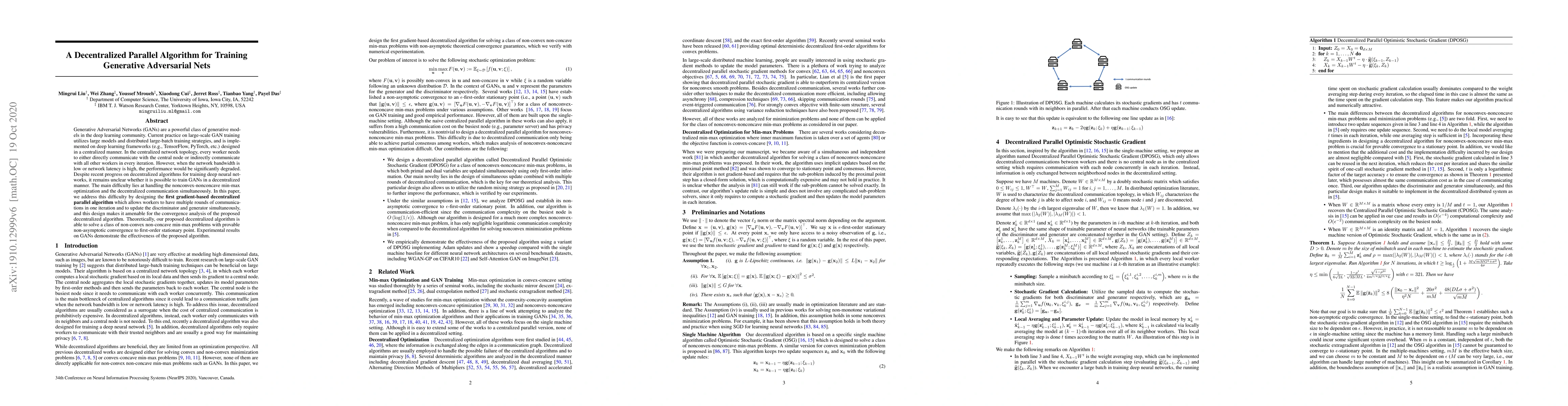 This paper introduces the first gradient-based decentralized parallel algorithm for training Generative Adversarial Networks (GANs), addressing the challenge of nonconvex-nonconcave optimization in a decentralized setting. The proposed algorithm allows for multiple rounds of communication per iteration, enabling simultaneous updates to the discriminator and generator, and demonstrates non-asymptotic convergence to a first-order stationary point.