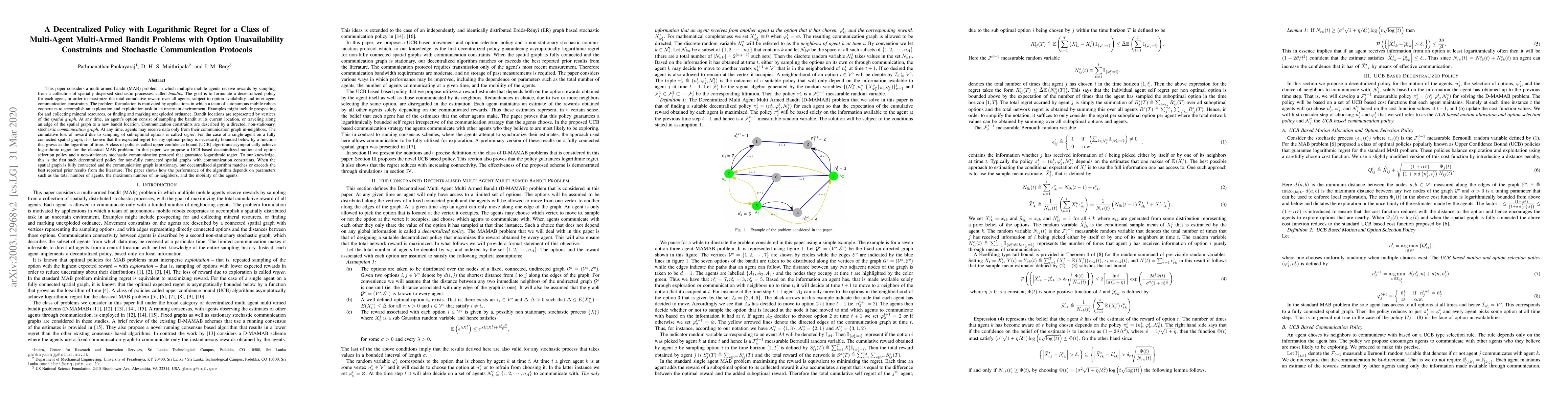 This paper proposes a decentralized policy using upper confidence bound (UCB) algorithms to achieve logarithmic regret for multi-agent multi-armed bandit problems with option unavailability and stochastic communication constraints. The approach is the first to address such decentralized policies for non-fully connected spatial graphs under communication limitations.