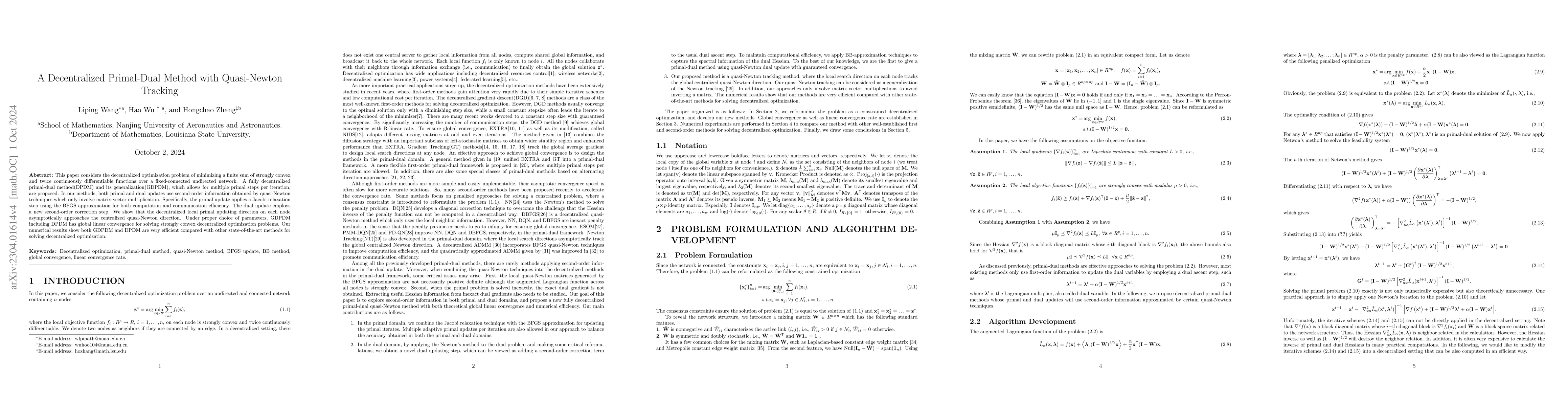This paper proposes a decentralized primal dual algorithm that leverages quasi-Newton tracking for optimizing a sum of strongly convex functions over a network. The algorithm exhibits global linear convergence and uses second-order information with efficient Hessian approximations, demonstrating effectiveness through numerical results.