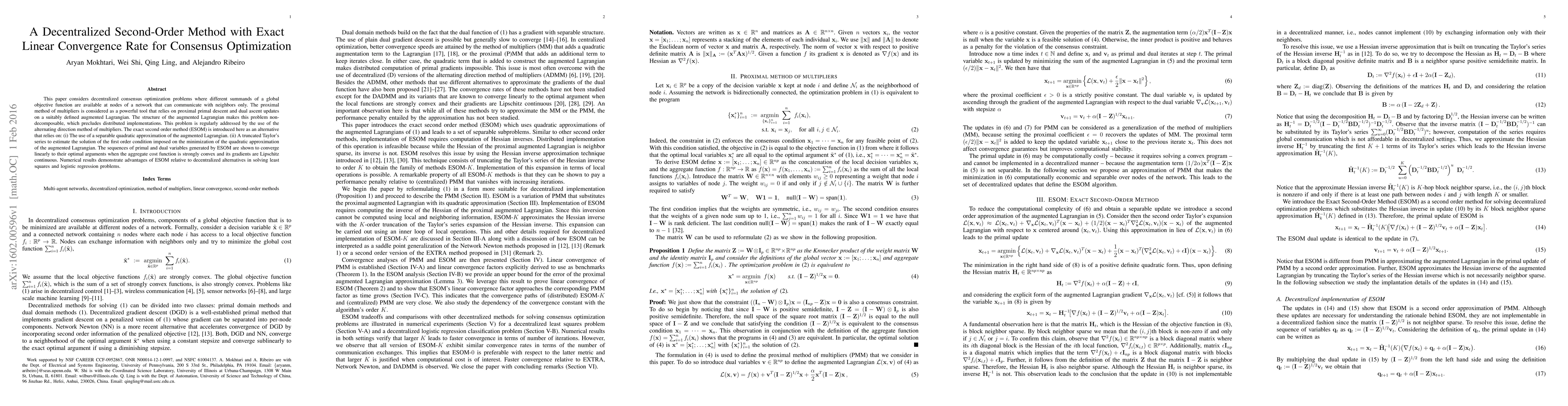 This paper introduces a decentralized second-order method, ESOM, for consensus optimization in networks, achieving exact linear convergence under strong convexity and Lipschitz continuity conditions. ESOM leverages a quadratic approximation and truncated Taylor series, demonstrating superior performance over decentralized alternatives in least squares and logistic regression.