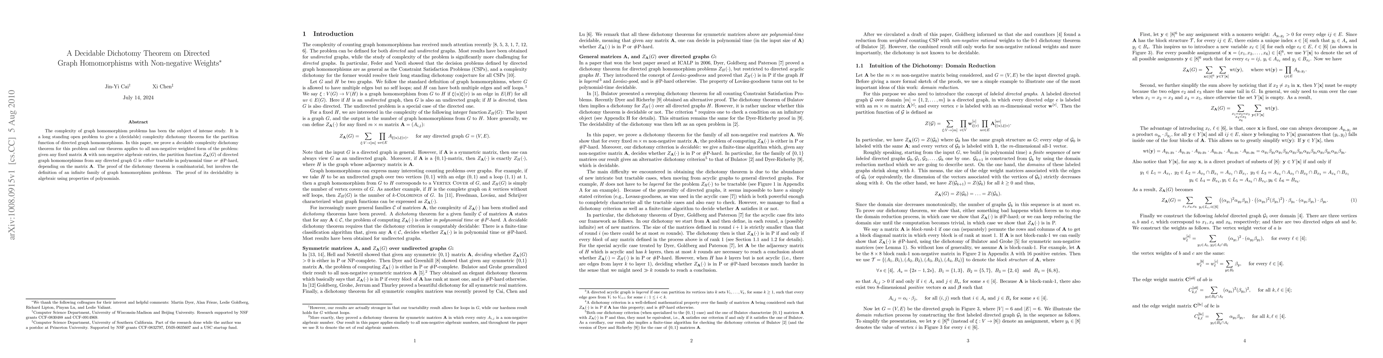 This paper establishes a decidable complexity dichotomy theorem for non-negative weighted directed graph homomorphisms, proving that the partition function is either tractable in polynomial time or #P-hard, depending on the fixed matrix A. The proof is combinatorial and algebraic, leveraging properties of polynomials.