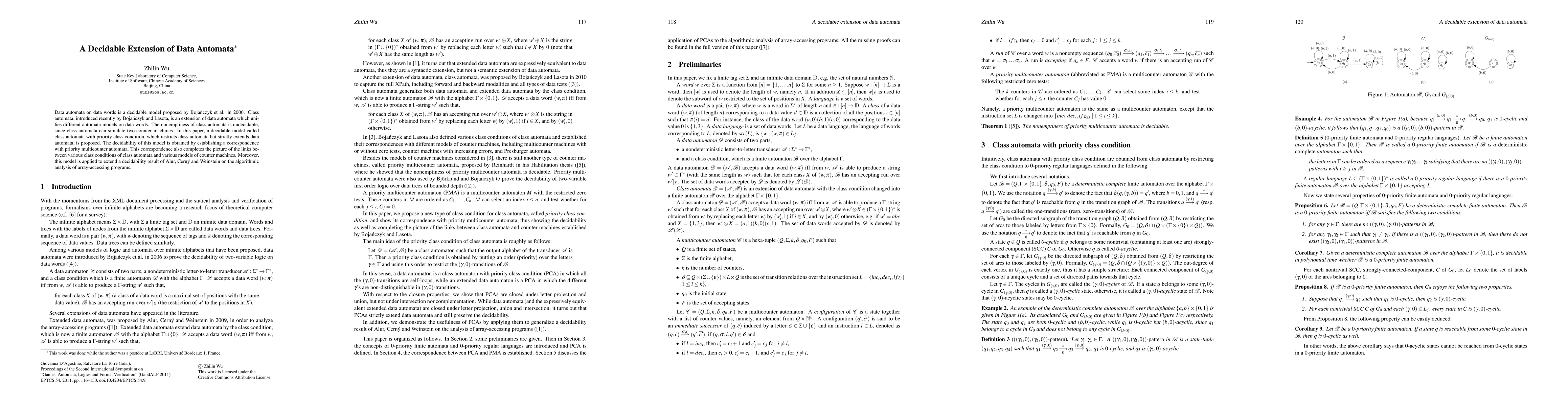 A new model called class automata with priority class condition is proposed as a decidable extension of data automata, linking it to counter machines and extending previous decidability results.