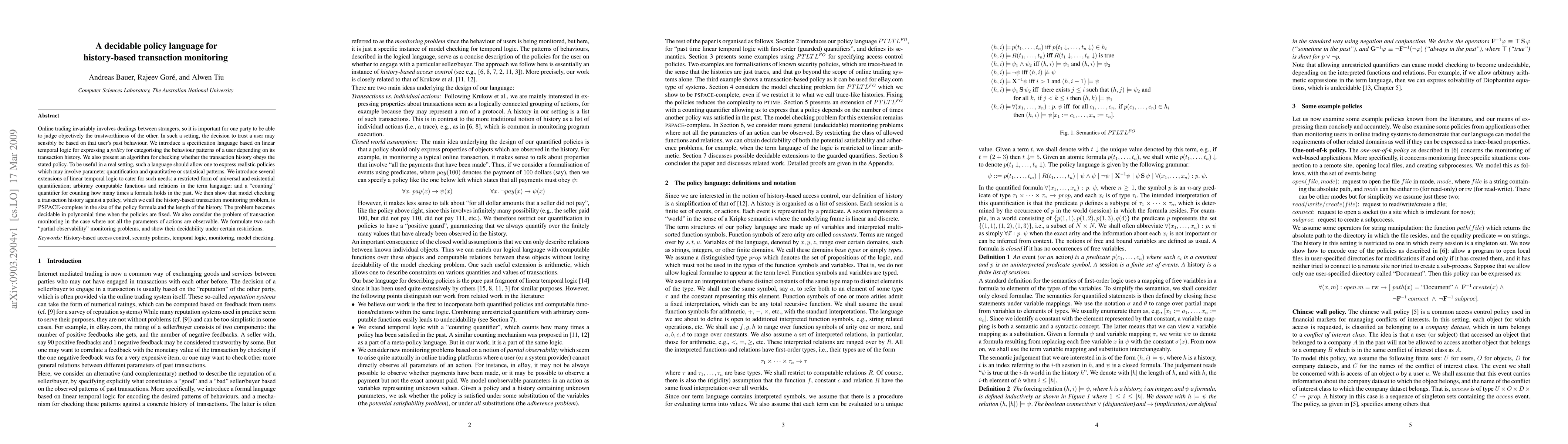 This paper introduces a decidable policy language based on linear temporal logic for monitoring transaction histories to assess user trustworthiness. It extends the language to handle quantification and statistical patterns, and proves that the history-based transaction monitoring problem is PSPACE-complete but becomes decidable in polynomial time when policies are fixed. It also addresses the problem of monitoring under partial observability.