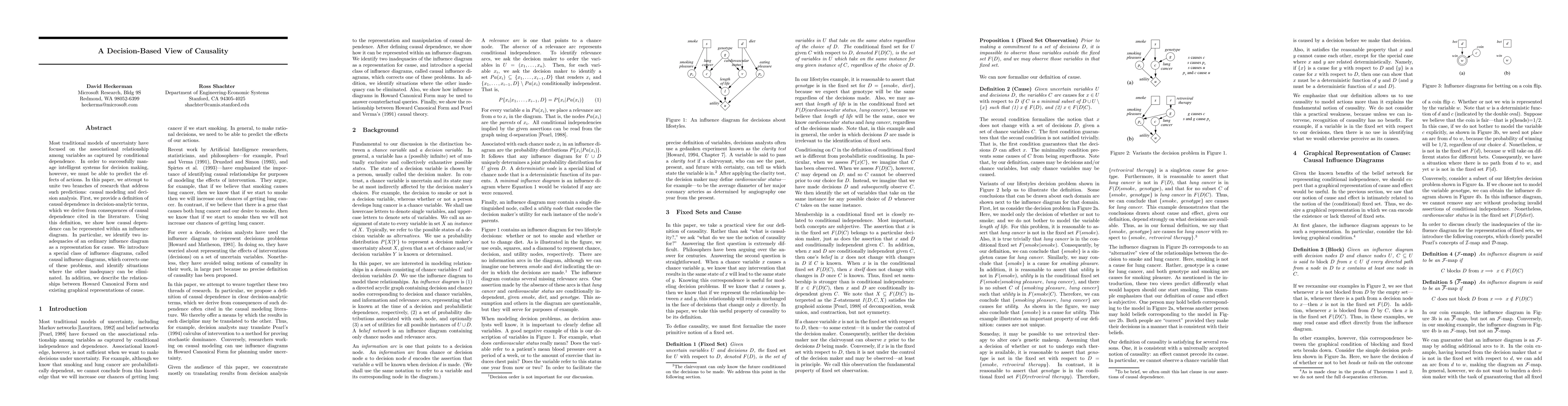 Most traditional models of uncertainty have focused on the associational relationship among variables as captured by conditional dependence. In order to successfully manage intelligent systems for decision making, however, we must be able to predict the effects of actions. In this paper, we attempt to unite two branches of research that address such predictions: causal modeling and decision analysis. First, we provide a definition of causal dependence in decision-analytic terms, which we derive from consequences of causal dependence cited in the literature. Using this definition, we show how causal dependence can be represented within an influence diagram. In particular, we identify two inadequacies of an ordinary influence diagram as a representation for cause. We introduce a special class of influence diagrams, called causal influence diagrams, which corrects one of these problems, and identify situations where the other inadequacy can be eliminated. In addition, we describe the relationships between Howard Canonical Form and existing graphical representations of cause.
