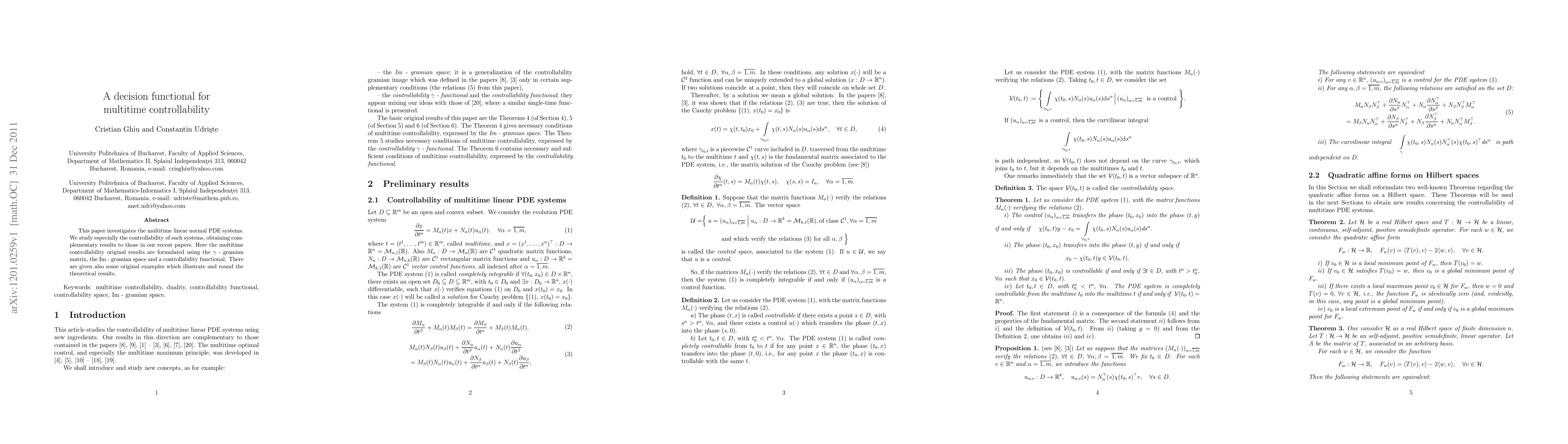This paper formulates a decision functional for multitime controllability in linear normal PDE systems using the $\gamma$-gramian matrix, the Im-gramian space, and a controllability functional, providing complementary results to previous studies. Original examples are presented to illustrate the theoretical findings.