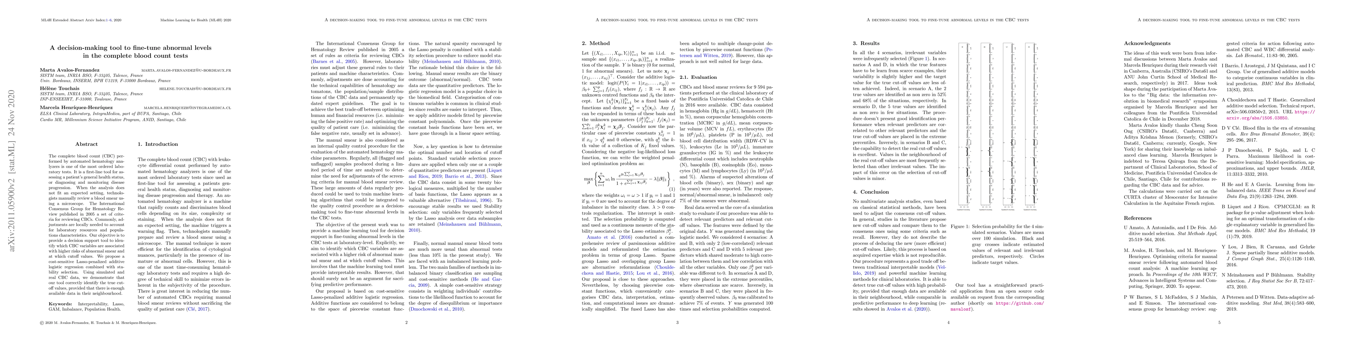 The complete blood count (CBC) performed by automated hematology analyzers is one of the most ordered laboratory tests. It is a first-line tool for assessing a patient's general health status, or diagnosing and monitoring disease progression. When the analysis does not fit an expected setting, technologists manually review a blood smear using a microscope. The International Consensus Group for Hematology Review published in 2005 a set of criteria for reviewing CBCs. Commonly, adjustments are locally needed to account for laboratory resources and populations characteristics. Our objective is to provide a decision support tool to identify which CBC variables are associated with higher risks of abnormal smear and at which cutoff values. We propose a cost-sensitive Lasso-penalized additive logistic regression combined with stability selection. Using simulated and real CBC data, we demonstrate that our tool correctly identify the true cutoff values, provided that there is enough available data in their neighbourhood.