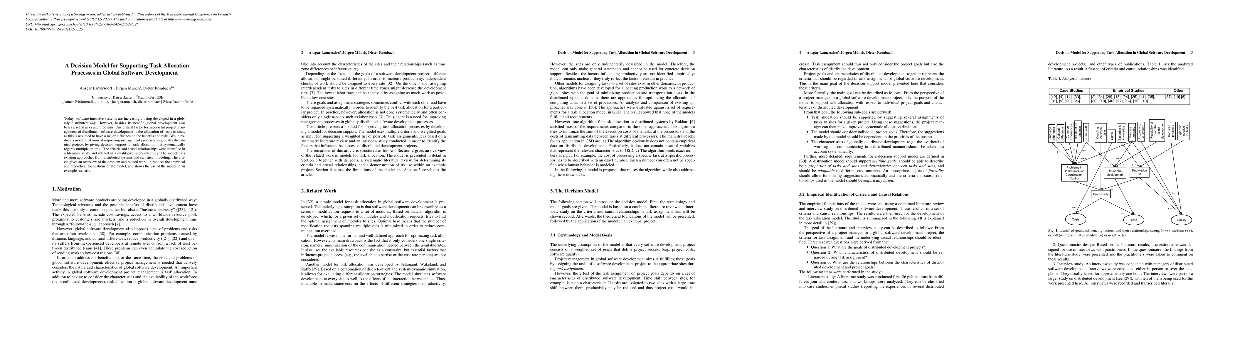 This paper introduces a decision model to enhance task allocation in globally distributed software development, addressing risks and benefits through systematic consideration of multiple criteria. The model combines insights from literature and qualitative interviews, leveraging existing distributed systems and statistical modeling techniques to provide decision support in project management.