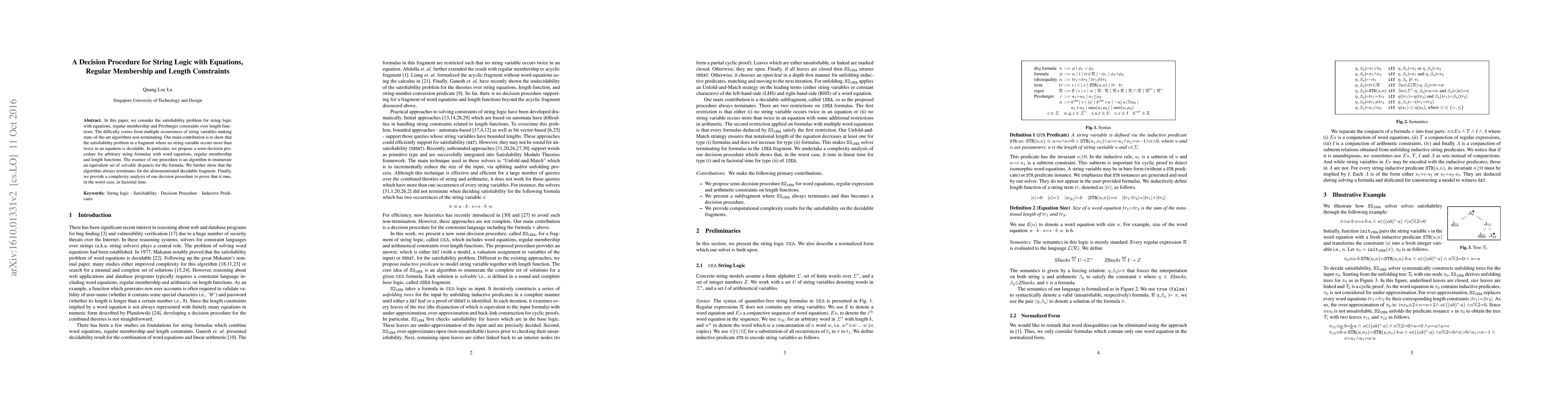 This paper presents a decidable fragment of string logic with equations, regular membership, and length constraints, where no string variable occurs more than twice in an equation. The authors propose a semi-decision procedure that enumerates solvable disjuncts and guarantees termination for this fragment, with a complexity analysis showing worst-case factorial time.