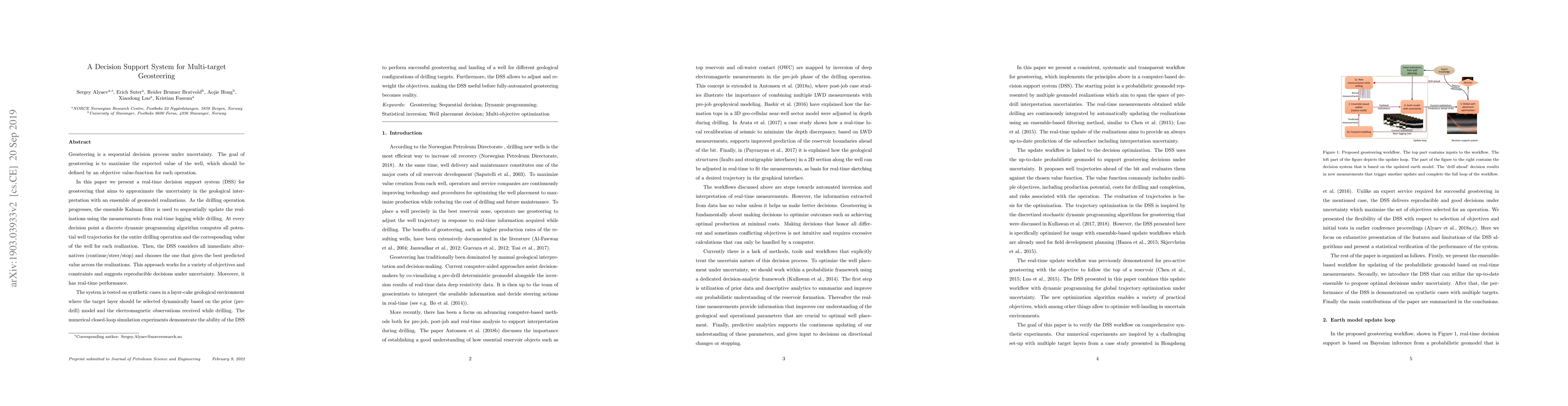 A real-time decision support system for geosteering is presented, approximating uncertainty with an ensemble of geomodel realizations to maximize the expected value of a well.