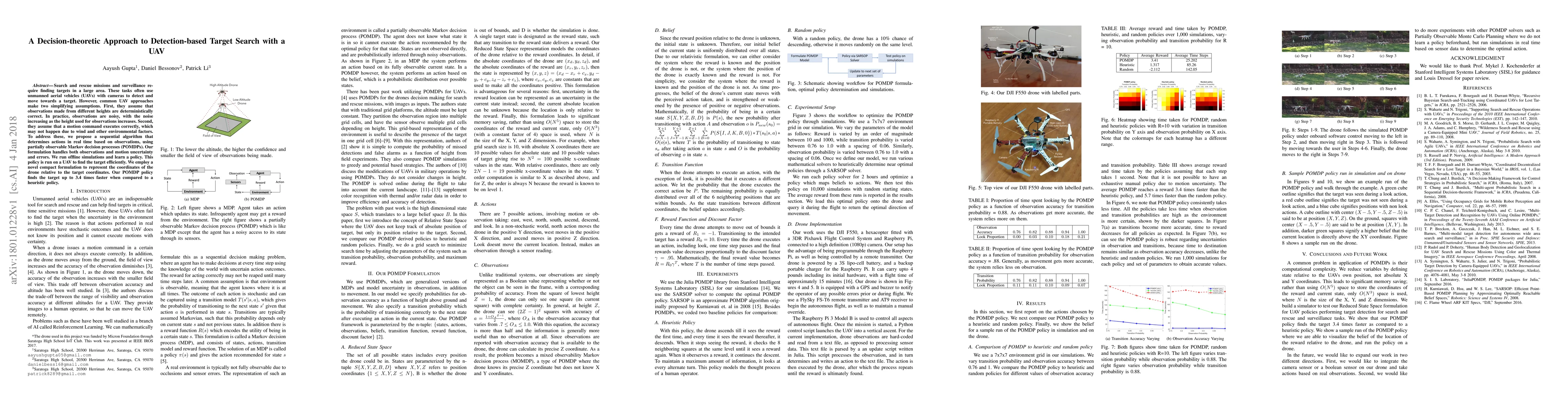 Search and rescue missions and surveillance require finding targets in a large area. These tasks often use unmanned aerial vehicles (UAVs) with cameras to detect and move towards a target. However, common UAV approaches make two simplifying assumptions. First, they assume that observations made from different heights are deterministically correct. In practice, observations are noisy, with the noise increasing as the height used for observations increases. Second, they assume that a motion command executes correctly, which may not happen due to wind and other environmental factors. To address these, we propose a sequential algorithm that determines actions in real time based on observations, using partially observable Markov decision processes (POMDPs). Our formulation handles both observations and motion uncertainty and errors. We run offline simulations and learn a policy. This policy is run on a UAV to find the target efficiently. We employ a novel compact formulation to represent the coordinates of the drone relative to the target coordinates. Our POMDP policy finds the target up to 3.4 times faster when compared to a heuristic policy.