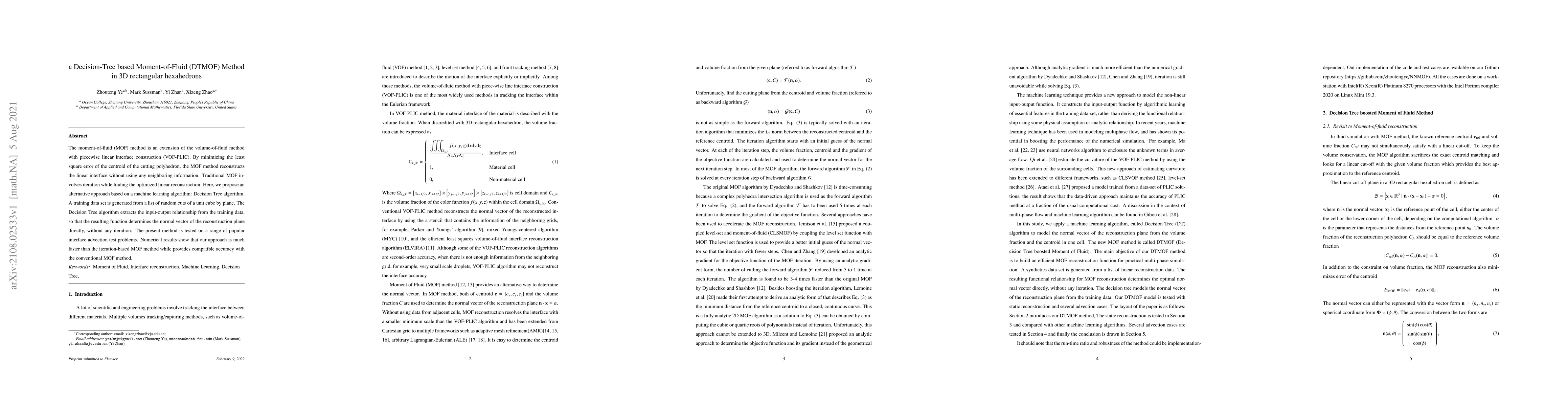 The moment-of-fluid (MOF) method is an extension of the volume-of-fluid method with piecewise linear interface construction (VOF-PLIC). By minimizing the least square error of the centroid of the cutting polyhedron, the MOF method reconstructs the linear interface without using any neighboring information. Traditional MOF involves iteration while finding the optimized linear reconstruction. Here, we propose an alternative approach based on a machine learning algorithm: Decision Tree algorithm. A training data set is generated from a list of random cuts of a unit cube by plane. The Decision Tree algorithm extracts the input-output relationship from the training data, so that the resulting function determines the normal vector of the reconstruction plane directly, without any iteration. The present method is tested on a range of popular interface advection test problems. Numerical results show that our approach is much faster than the iteration-based MOF method while provides compatible accuracy with the conventional MOF method.