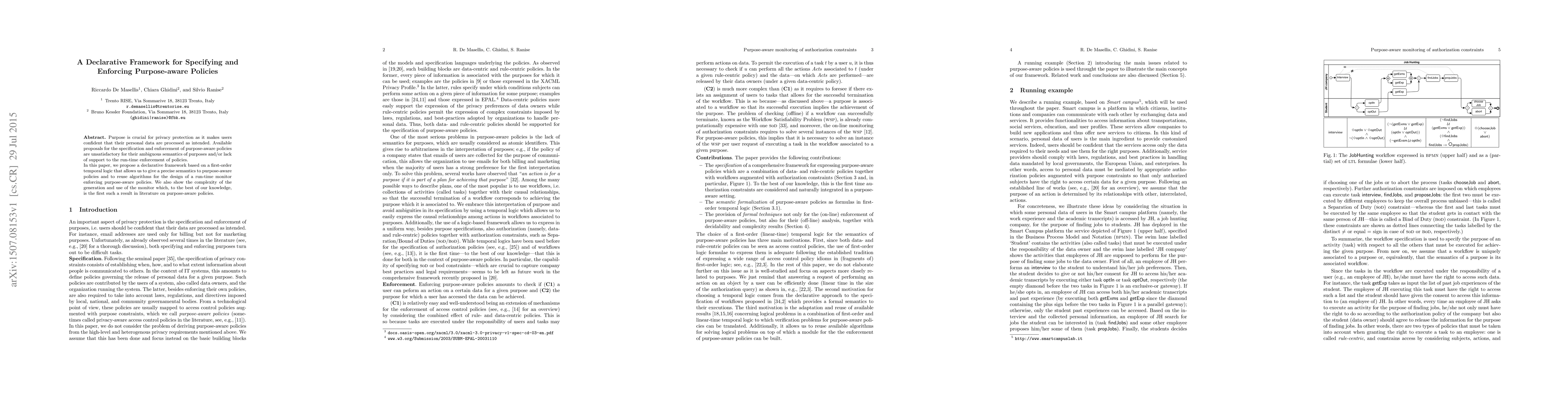 Purpose is crucial for privacy protection as it makes users confident that their personal data are processed as intended. Available proposals for the specification and enforcement of purpose-aware policies are unsatisfactory for their ambiguous semantics of purposes and/or lack of support to the run-time enforcement of policies. In this paper, we propose a declarative framework based on a first-order temporal logic that allows us to give a precise semantics to purpose-aware policies and to reuse algorithms for the design of a run-time monitor enforcing purpose-aware policies. We also show the complexity of the generation and use of the monitor which, to the best of our knowledge, is the first such a result in literature on purpose-aware policies.