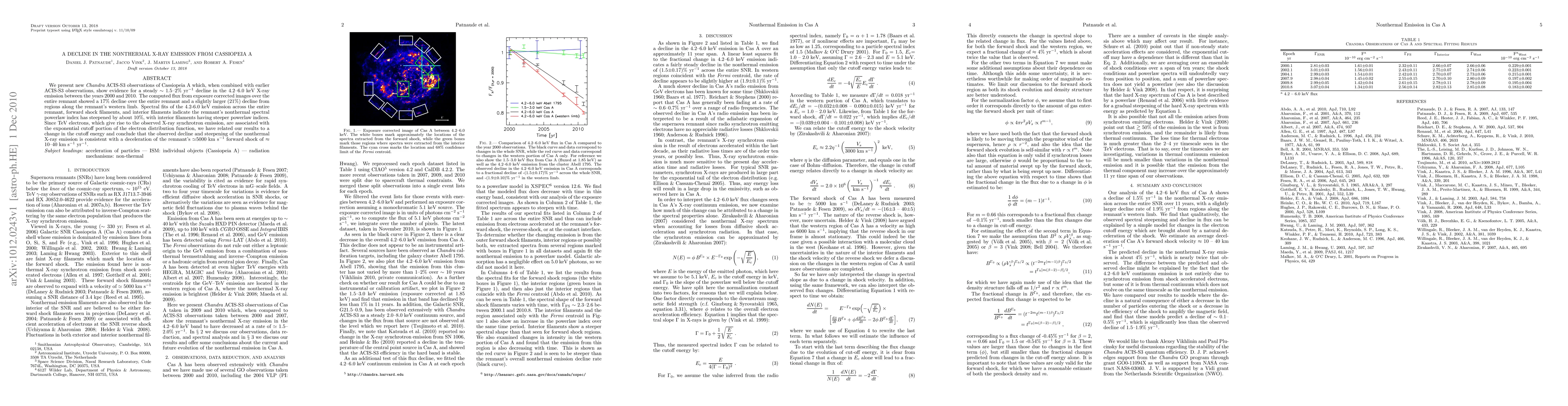 We present new Chandra ACIS-S3 observations of Cassiopeia A which, when combined with earlier ACIS-S3 observations, show evidence for a steady ~ 1.5-2%/yr decline in the 4.2-6.0 keV X-ray emission between the years 2000 and 2010. The computed flux from exposure corrected images over the entire remnant showed a 17% decline over the entire remnant and a slightly larger (21%) decline from regions along the remnant's western limb. Spectral fits of the 4.2-6.0 keV emission across the entire remnant, forward shock filaments, and interior filaments indicate the remnant's nonthermal spectral powerlaw index has steepened by about 10%, with interior filaments having steeper powerlaw indices. Since TeV electrons, which give rise to the observed X-ray synchrotron emission, are associated with the exponential cutoff portion of the electron distribution function, we have related our results to a change in the cutoff energy and conclude that the observed decline and steepening of the nonthermal X-ray emission is consistent with a deceleration of the remnant's ~5000 km/s forward shock of ~10--40 km/s/yr