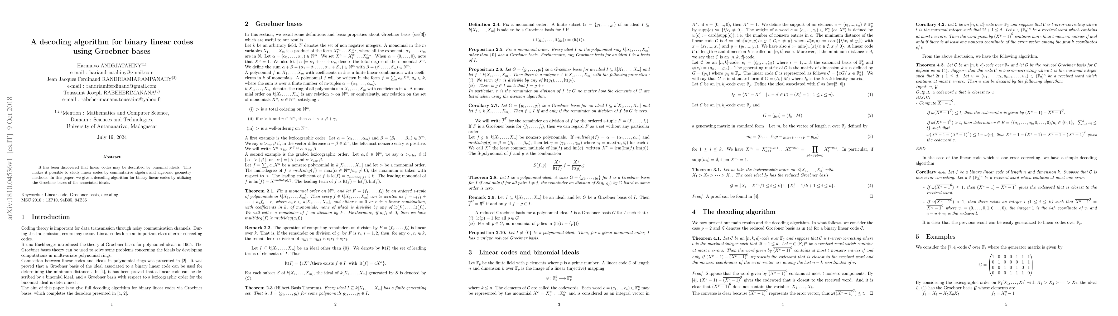 Summary: This paper presents a decoding algorithm for binary linear codes using Groebner bases, leveraging the representation of codes as binomial ideals and employing commutative algebra and algebraic geometry techniques. The proposed method enhances the efficiency of decoding processes.