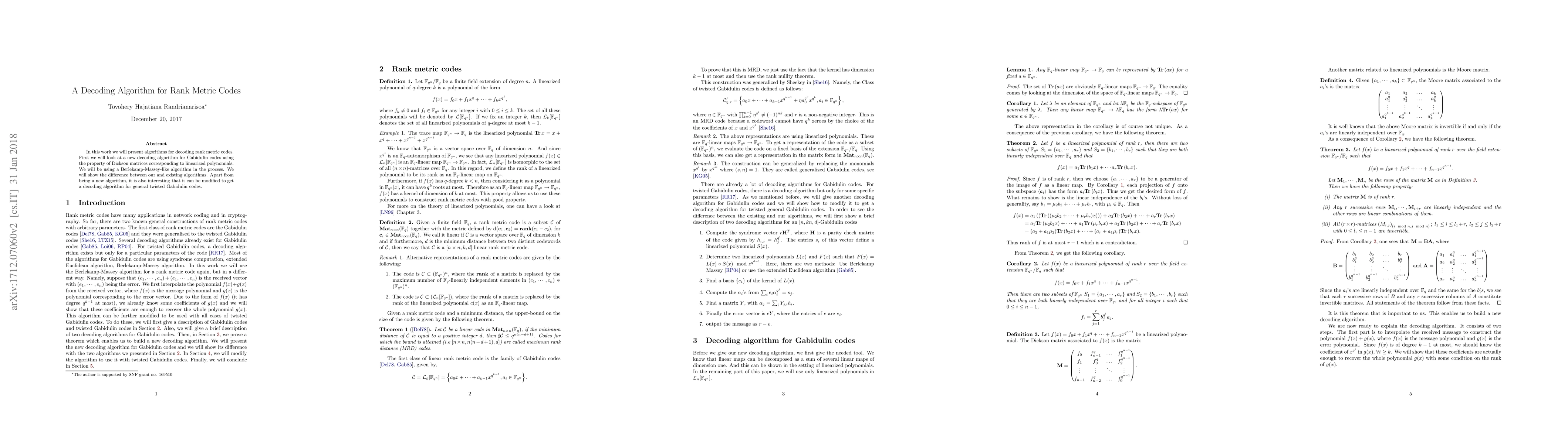In this work we will present algorithms for decoding rank metric codes. First we will look at a new decoding algorithm for Gabidulin codes using the property of Dickson matrices corresponding to linearized polynomials. We will be using a Berlekamp-Massey-like algorithm in the process. We will show the difference between our and existing algorithms. Apart from being a new algorithm, it is also interesting that it can be modified to get a decoding algorithm for general twisted Gabidulin codes.