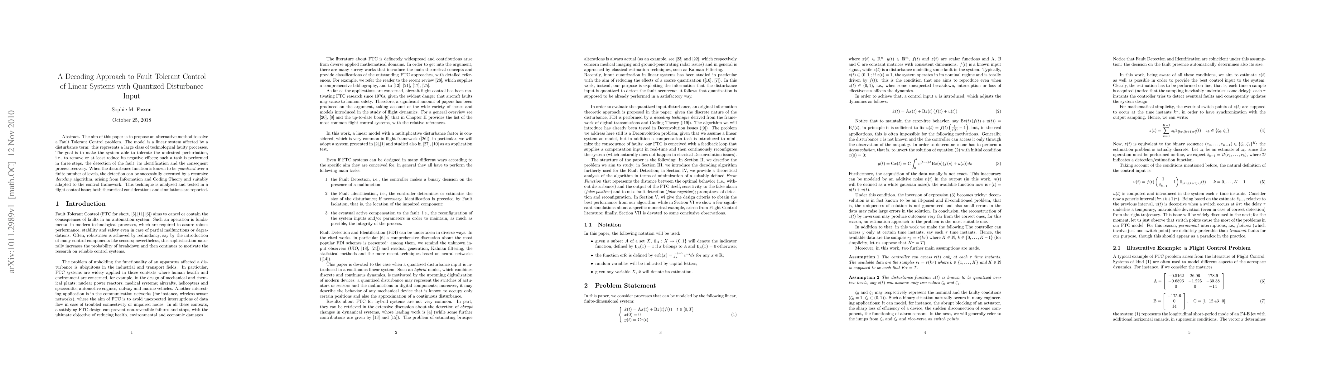 The aim of this paper is to propose an alternative method to solve a Fault Tolerant Control problem. The model is a linear system affected by a disturbance term: this represents a large class of technological faulty processes. The goal is to make the system able to tolerate the undesired perturbation, i.e., to remove or at least reduce its negative effects; such a task is performed in three steps: the detection of the fault, its identification and the consequent process recovery. When the disturbance function is known to be \emph{quantized} over a finite number of levels, the detection can be successfully executed by a recursive \emph{decoding} algorithm, arising from Information and Coding Theory and suitably adapted to the control framework. This technique is analyzed and tested in a flight control issue; both theoretical considerations and simulations are reported.