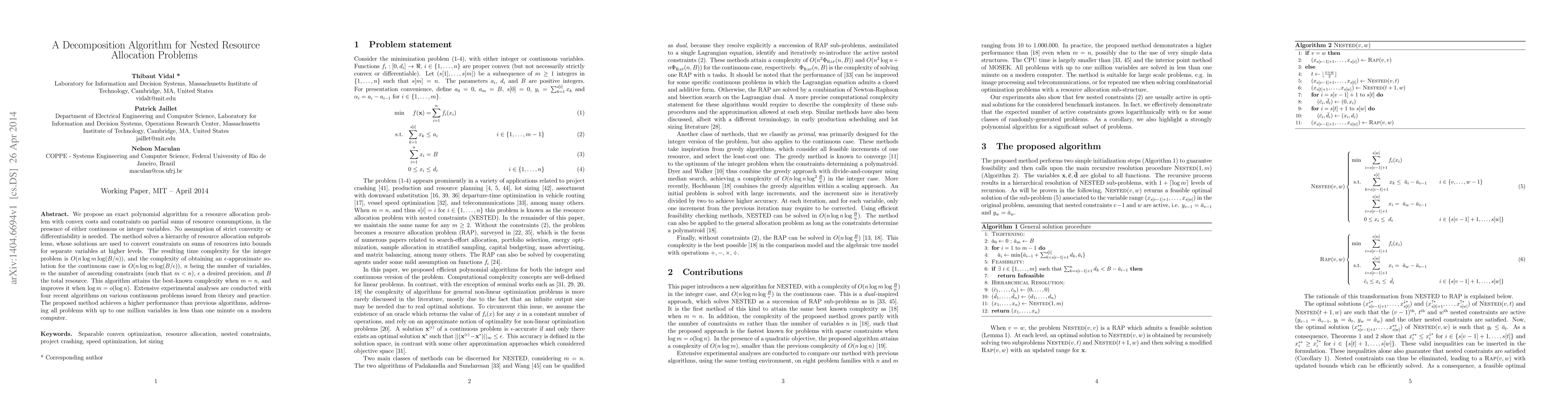 This paper introduces an efficient polynomial algorithm for nested resource allocation problems with convex costs and constraints, applicable to both continuous and integer variables. The method achieves optimal complexity for large problem sizes and outperforms existing algorithms in extensive experimental evaluations.