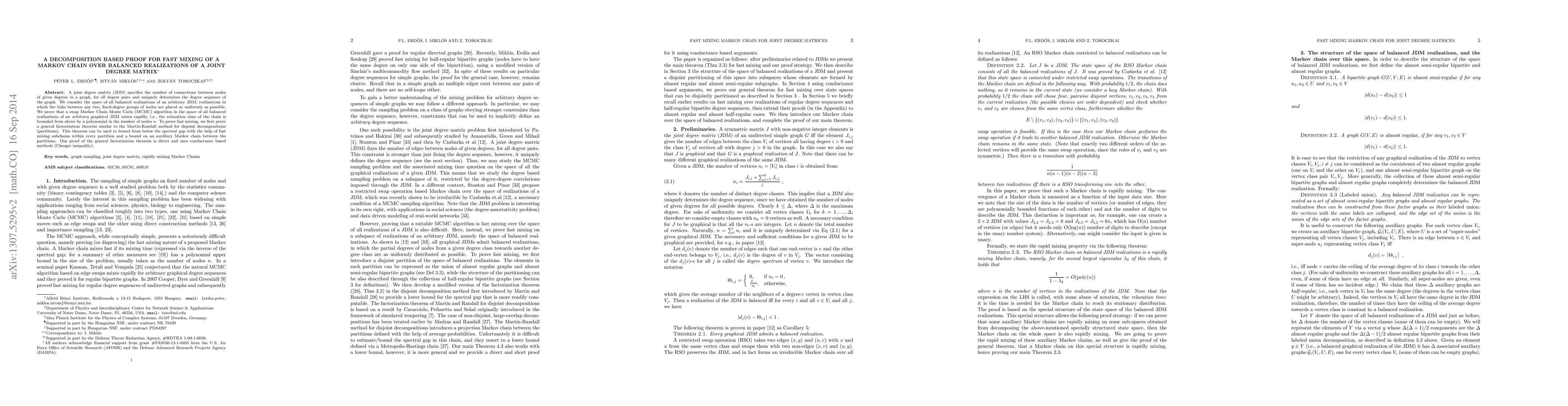 A joint degree matrix (JDM) specifies the number of connections between nodes of given degrees in a graph, for all degree pairs and uniquely determines the degree sequence of the graph. We consider the space of all balanced realizations of an arbitrary JDM, realizations in which the links between any two degree groups are placed as uniformly as possible. We prove that a swap Markov Chain Monte Carlo (MCMC) algorithm in the space of all balanced realizations of an {\em arbitrary} graphical JDM mixes rapidly, i.e., the relaxation time of the chain is bounded from above by a polynomial in the number of nodes $n$. To prove fast mixing, we first prove a general factorization theorem similar to the Martin-Randall method for disjoint decompositions (partitions). This theorem can be used to bound from below the spectral gap with the help of fast mixing subchains within every partition and a bound on an auxiliary Markov chain between the partitions. Our proof of the general factorization theorem is direct and uses conductance based methods (Cheeger inequality).